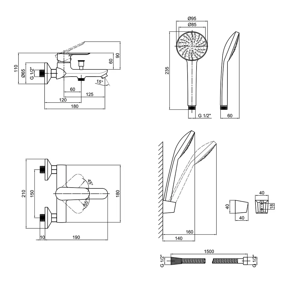 Змішувач, Лійка для ручного душу, Душовий шланг, Кронштейн для ручного душу, Кріплення