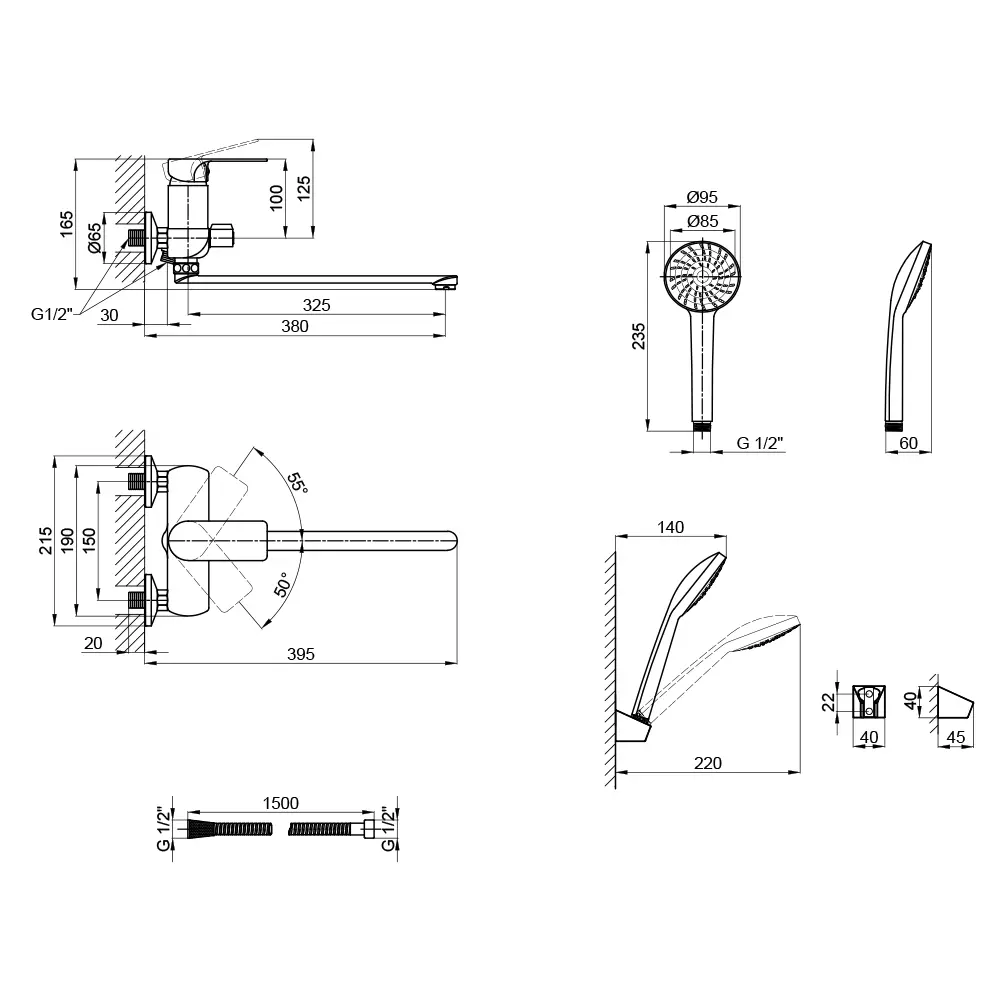 Змішувач, Лійка для ручного душу, Душовий шланг, Кронштейн для ручного душу, Кріпильні деталі