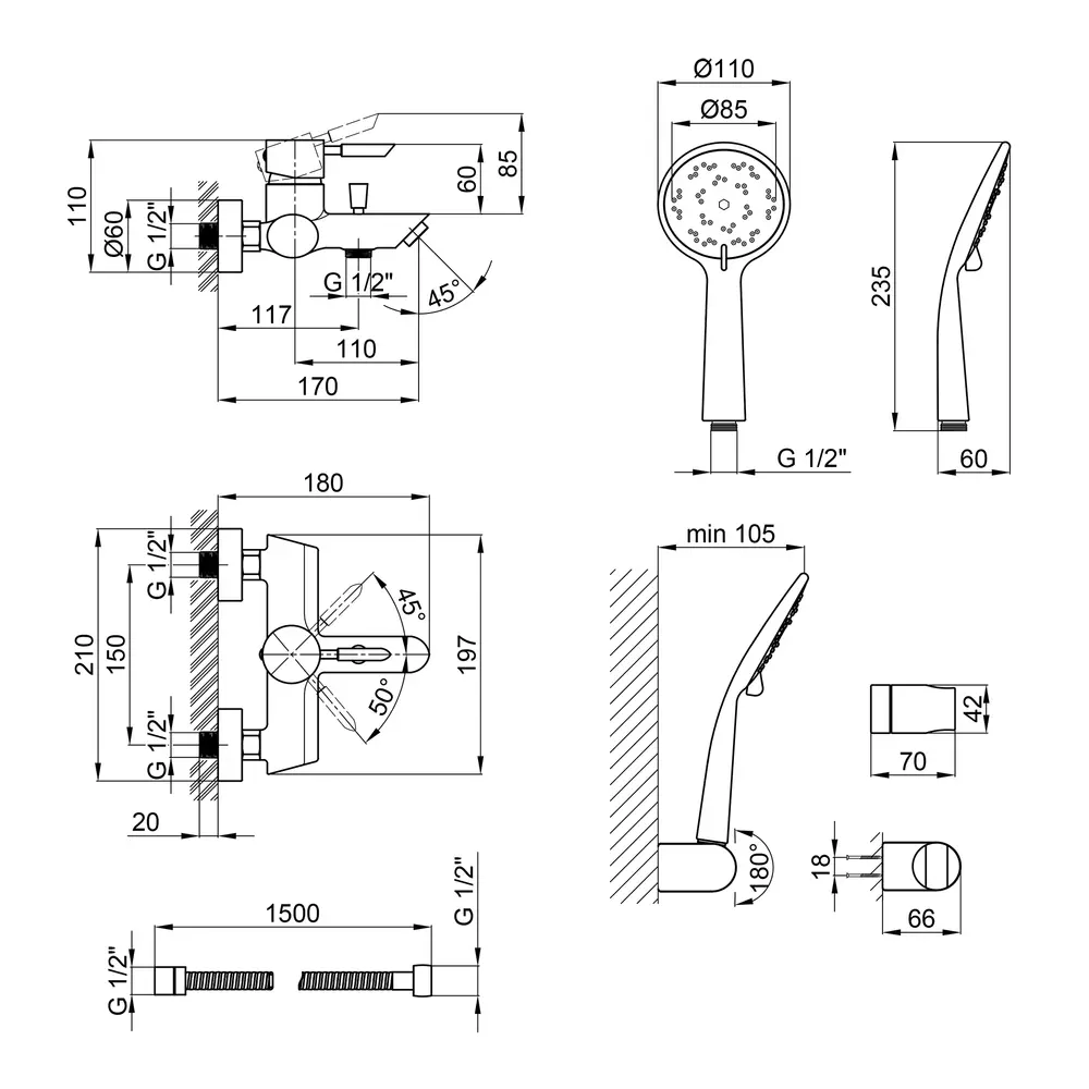 Змішувач, Лійка для ручного душу, Душовий шланг, Кронштейн для ручного душу, Кріпильні деталі