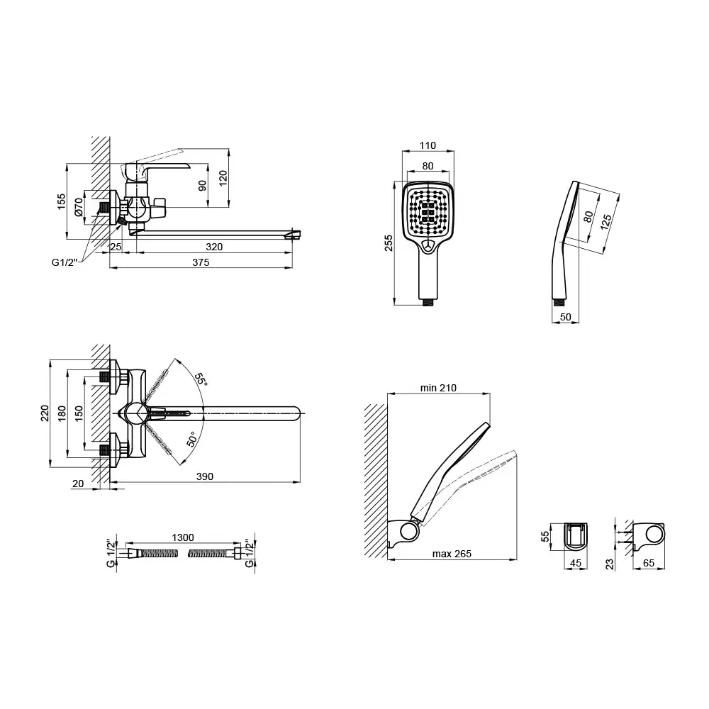 Змішувач, Душовий шланг, Лійка для ручного душу, Кронштейн, Кріплення