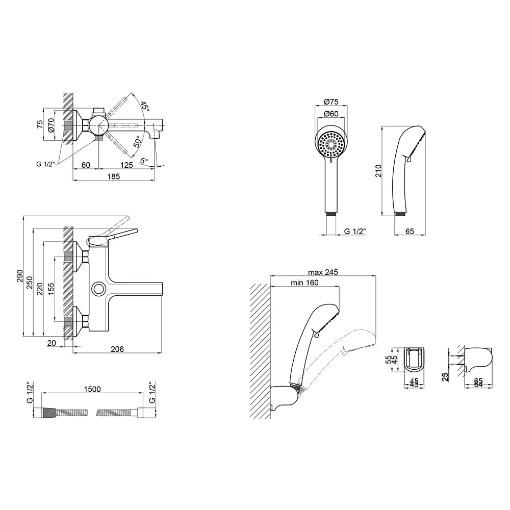 Змішувач, Лійка для ручного душу, Душовий шланг, Кронштейн для ручного душу, Кріпильні деталі