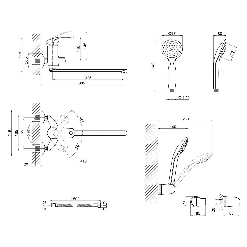 Змішувач, Лійка для ручного душу, Душовий шланг, Кронштейн для ручного душу, Кріпильні деталі