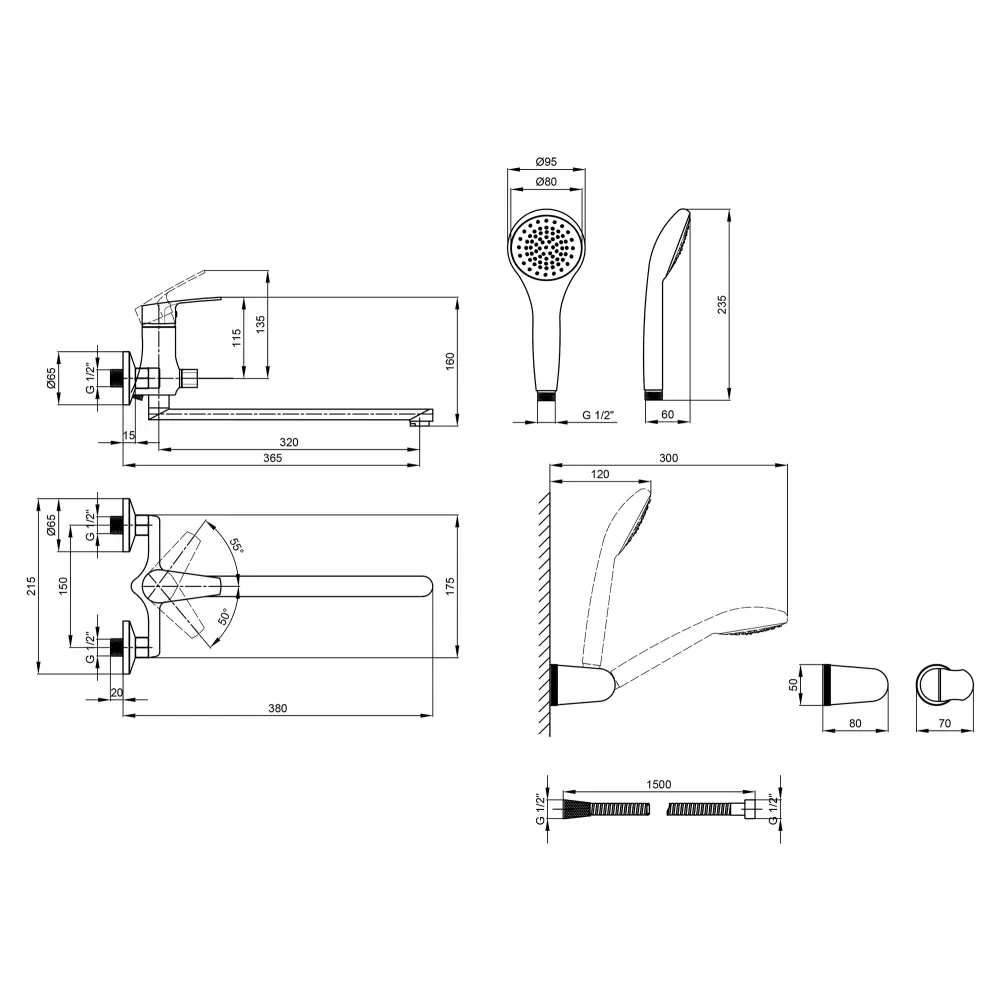 Змішувач, Лійка для ручного душу, Душовий шланг, Кронштейн для ручного душу, Кріпильні деталі