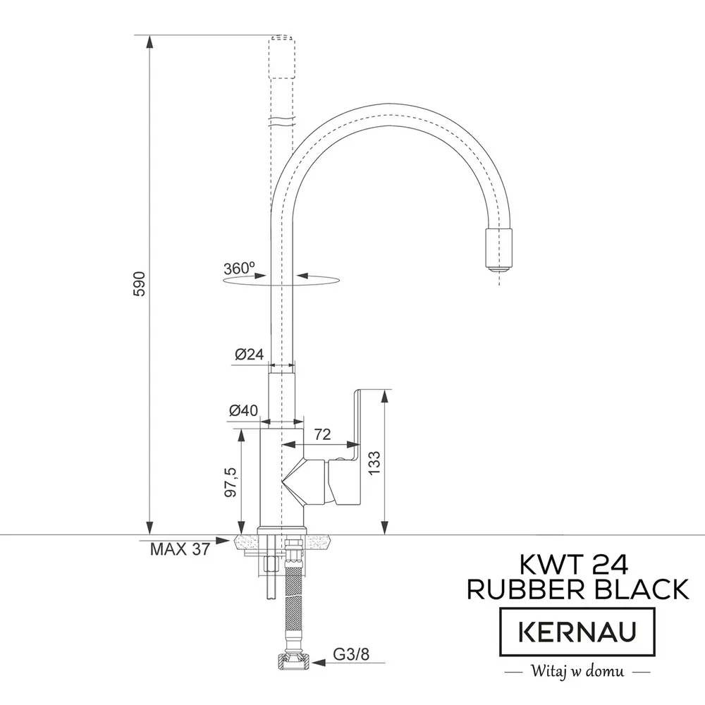 Смеситель KWT 24 RUBBER BLACK - смеситель предназначен для моек из стали или гранита. Он поворотлив носик (угол поворота на 360 °). Кран также оборудован аэратором, он смешивает поток воды с воздухом. Смеситель оснащен резиновым гибким носиком, который позволяет точно промывать посуду. Это дает оптическое впечатление гораздо более сильного напора, что приводит к экономии потребления воды. Этот аккумулятор имеет систему фиксации Easy Fix и систему удаления накипи. Смеситель KWT 24 RUBBER BLACK - незаменимый элемент любой современной кухни.