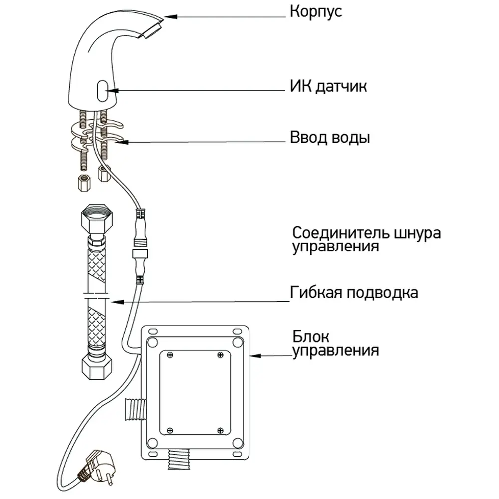 Корпус в зборі з кабелем 65 см, кріпильна гайка, 1 гнучка підводка 50 см (М10 - 1/2), блок управління з кабелем 80 см, комплект"Швидкий монтаж" (шурупи і дюбелі) для кріплення блоку управління, інструкція з експлуатації з гарантійним талоном