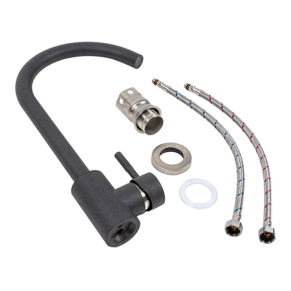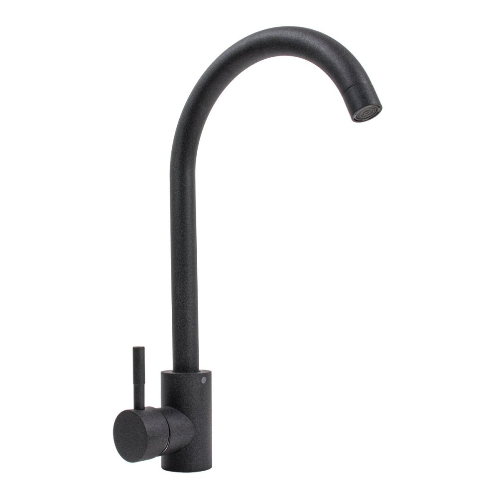 Смеситель кухонный VALESO 56 B NESP (3008 А) Карбон отличается современным и стильным дизайном. Он имеет цвет карбона, который придает элегантности и оригинальности вашей кухне. Его высота составляет 330 мм, что делает его идеальным для использования с большими сосудами и кастрюлями. Длина излива составляет 200 мм, что обеспечивает удобство при наполнении горшков и мытье посуды. Смеситель изготовлен из высококачественной нержавеющей стали SUS304, что гарантирует его длительный срок службы и коррозионную стойкость.