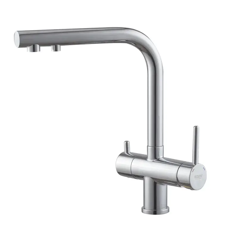 - С одним изливом и отдельными каналами для обычной и фильтрованной воды выглядит как стандартный смеситель, но имеет дополнительную ручку для управления очищенной водой.