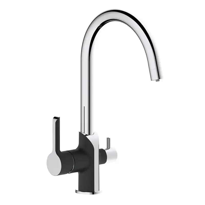 • С одним изливом и отдельными каналами для обычной и фильтрованной воды выглядит как стандартный смеситель, но имеет дополнительную ручку для управления очищенной водой.