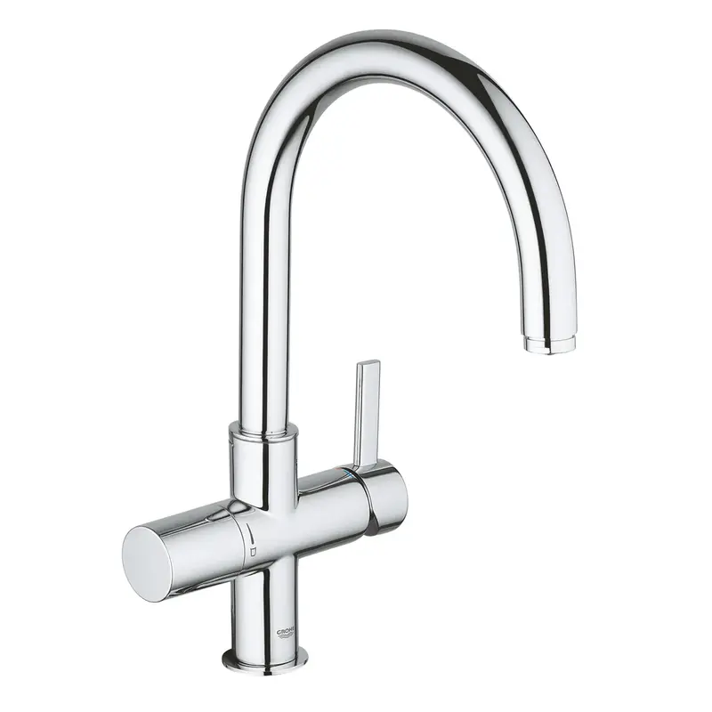 • С одним изливом и отдельными каналами для обычной и фильтрованной воды выглядит как стандартный смеситель, но имеет дополнительную ручку для управления очищенной водой.