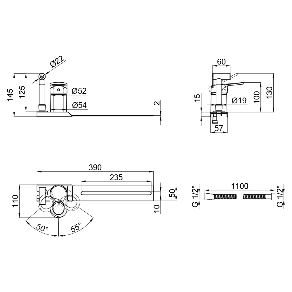 Змішувач, Душовий шланг, Лійка для гігієнічного душу, Рейка, Кріпильні деталі