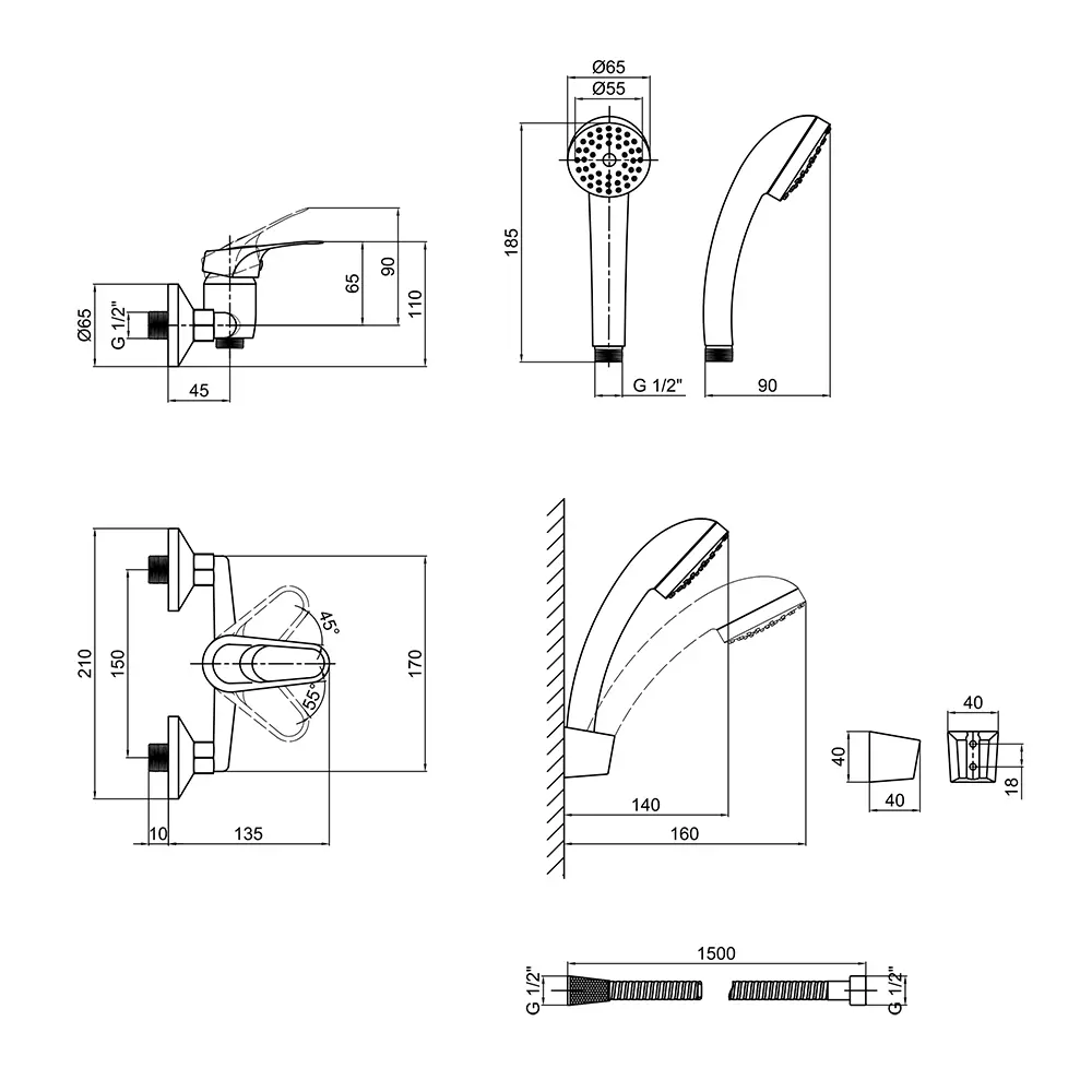 Змішувач, Лійка для ручного душу, Душовий шланг, Кронштейн, Кріпильні деталі