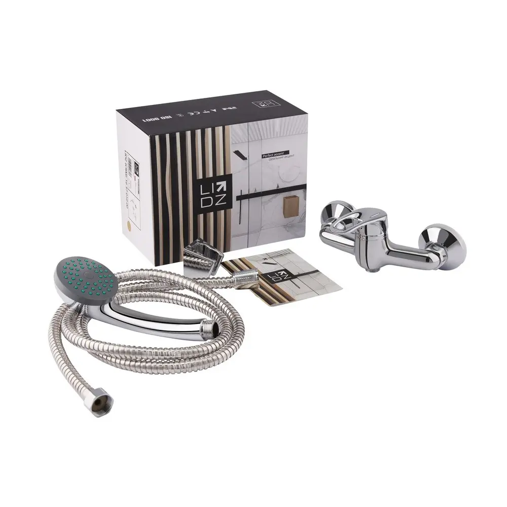 Змішувач для душу LIDZ (CRM) 16 37 010 00 виконаний з глянсовою блискучою поверхнею. Він та утримувач ручного душу монтуються на стіну в душовій кабіні без виливу, але з виходом для підключення шлангового під‘єднання. Круглі декоративні розетки приховають похибки установки на обробці ванної кімнати. Подача води вмикається завдяки картриджу після повороту важеля в необхідне положення. Для зручності на нього нанесено маркування Х + Г води та додано отвір проти ковзання мильних рук.
