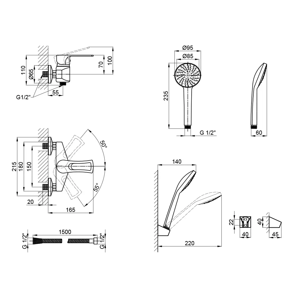 Змішувач, Лійка для ручного душу, Душовий шланг, Кронштейн для ручного душу, Кріпильні деталі