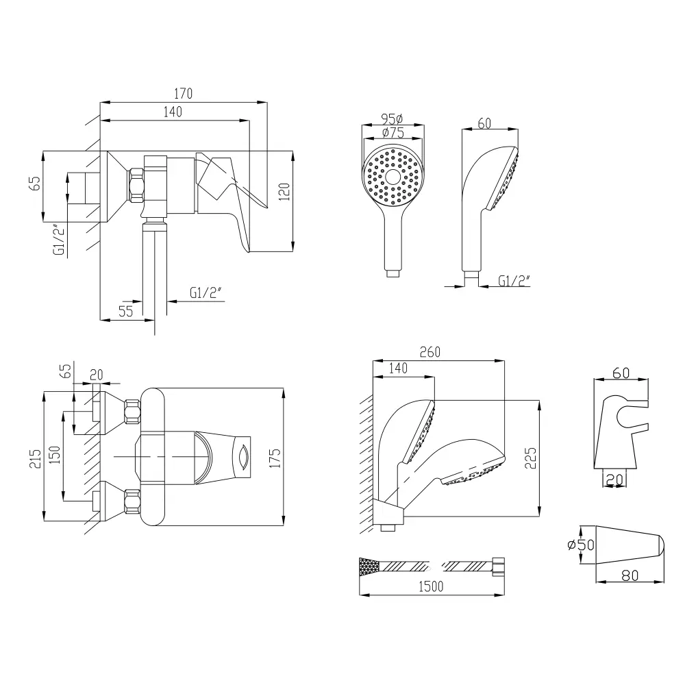Змішувач, Лійка для ручного душу, Душовий шланг, Тримач для душу, Кріплення
