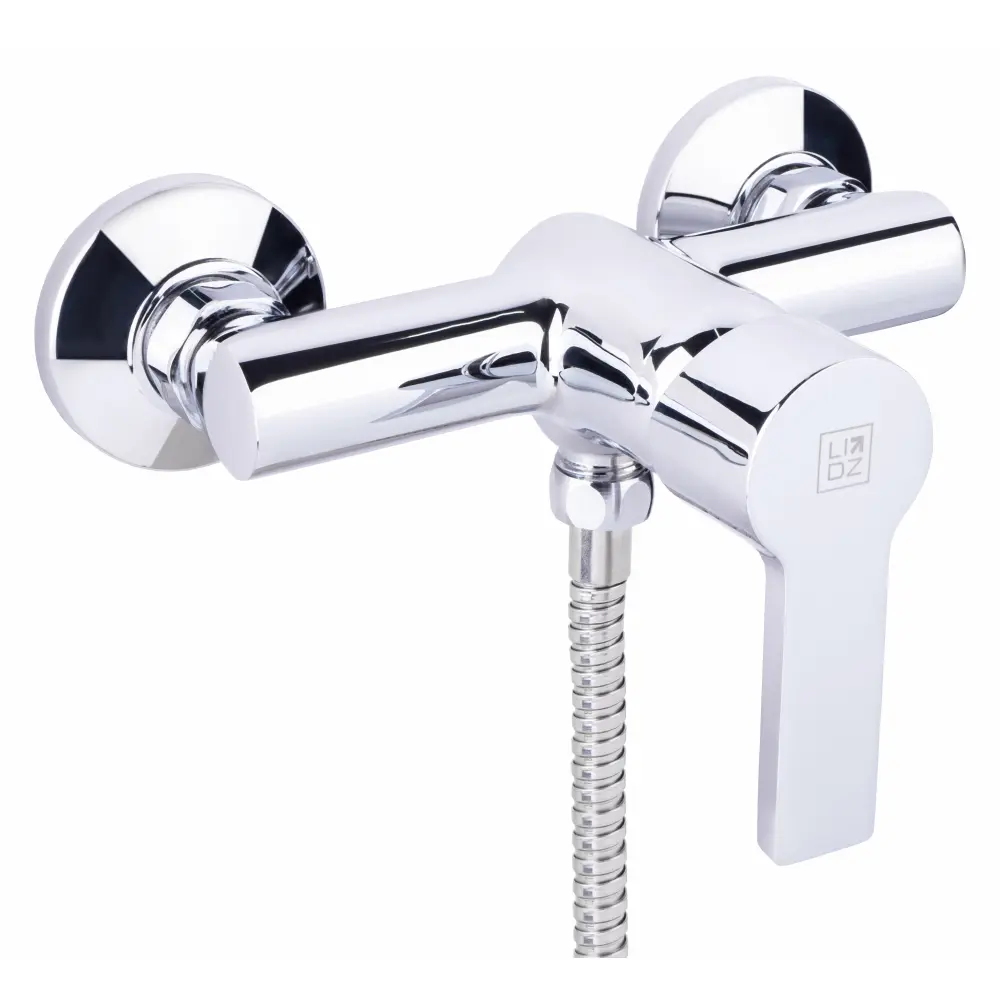 Змішувач для душу Lidz (CRM) J-Lex 40 010 виконаний з латуні з глянцевою блискучою поверхнею. Він і тримач ручного душу монтуються на стіну. Декоративні розетки приховають похибки установки на обробці ванної кімнати. Подача води здійснюється завдяки повороту важеля в потрібне положення.