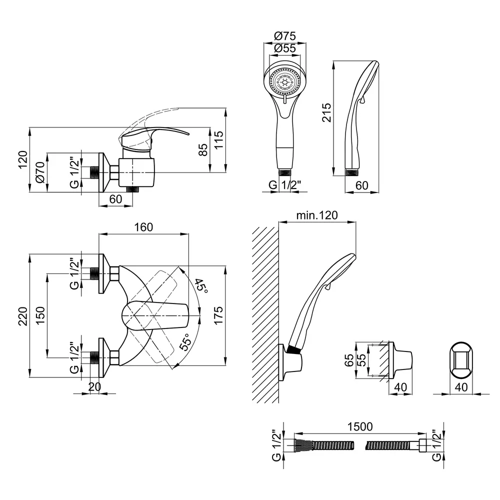Змішувач, Душовий шланг, Лійка для ручного душу, Тримач для душу, Кріплення