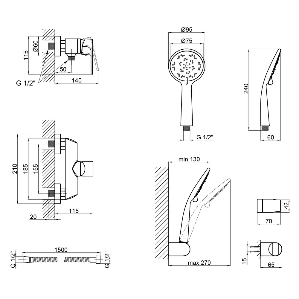 Змішувач, Лійка для ручного душу, Душовий шланг, Кронштейн, Кріпильні деталі