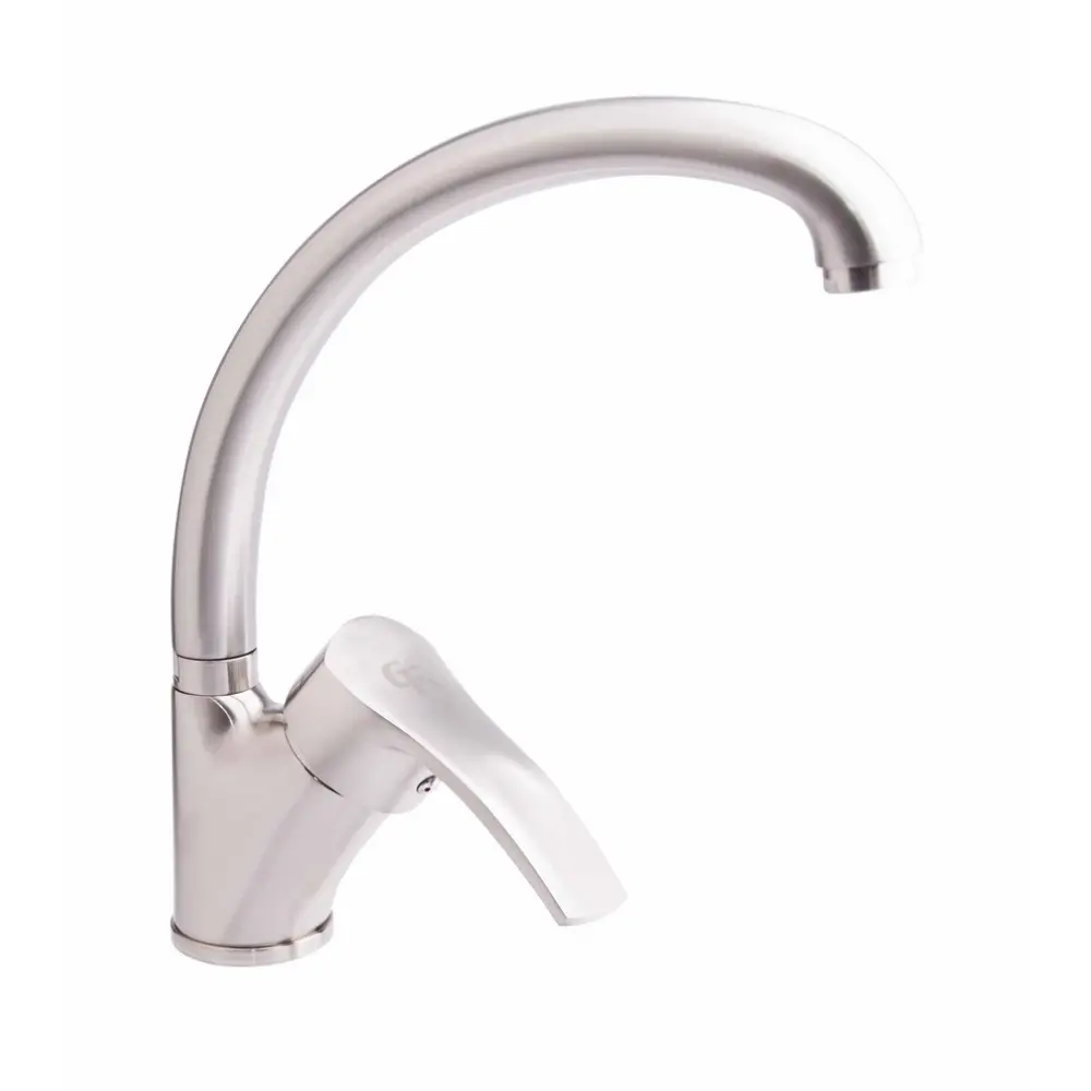 Змішувач для кухні GF (NKS)S-03-012F виготовлений з силуміну. Має брашовану нікельовану поверхню, завдяки якій виглядає оригінально. Змішувач виконаний в класичному стилі, з високим С-виливом і зручною ручкою для перемикання холодної і гарячої води.