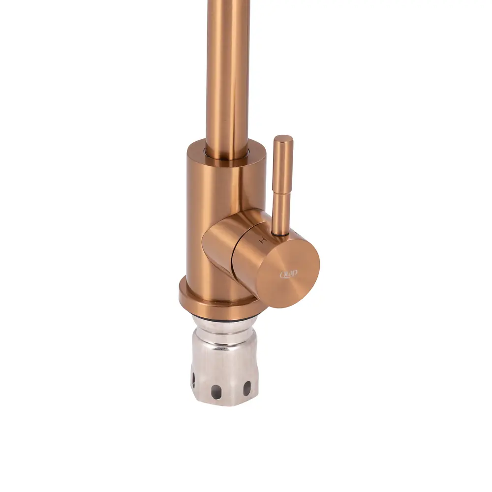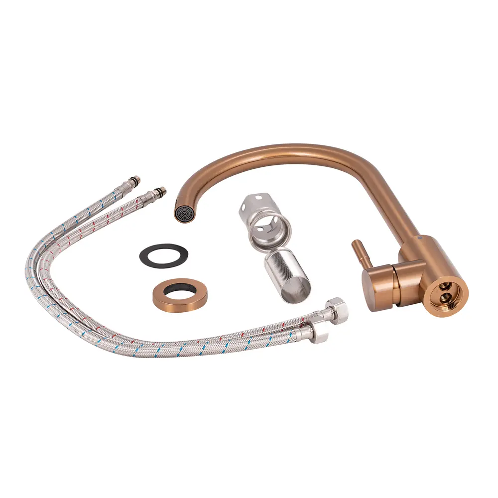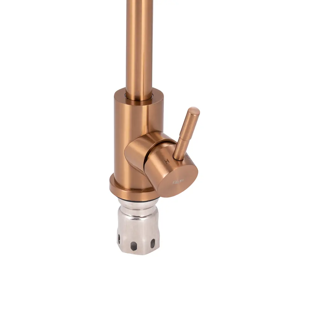 Змішувач для кухні Qtap D007FBR PVD виготовлений з високоякісної харчової латуні, яка стійка до впливу корозії, ударів і появи тріщин. Бронзова глянцева поверхня корпусу змішувача надає йому привабливості. Змішувач має одноважільне управління, за допомогою якого можна відрегулювати температуру і напір холодної та гарячої води. Виконаний в сучасному стилі, з поворотним виливом та стане справжньою родзинкою в інтер‘єрі кухні.