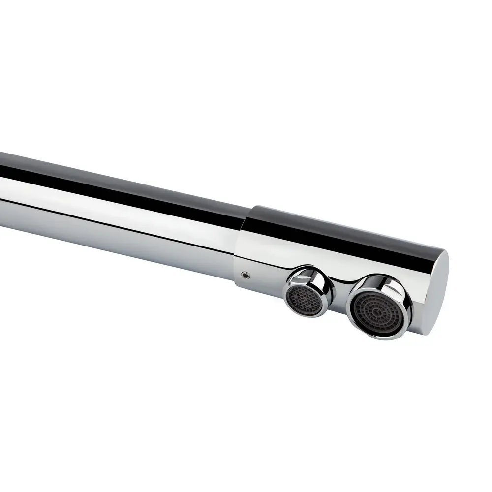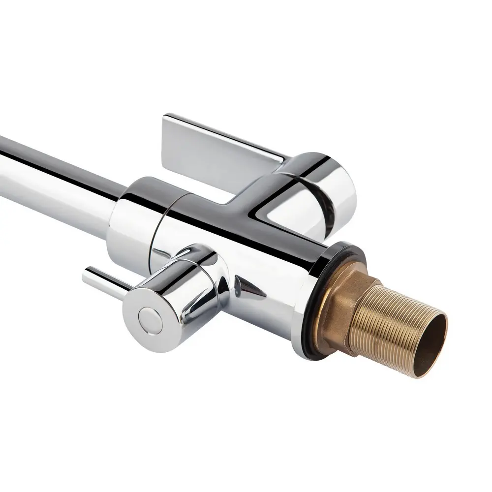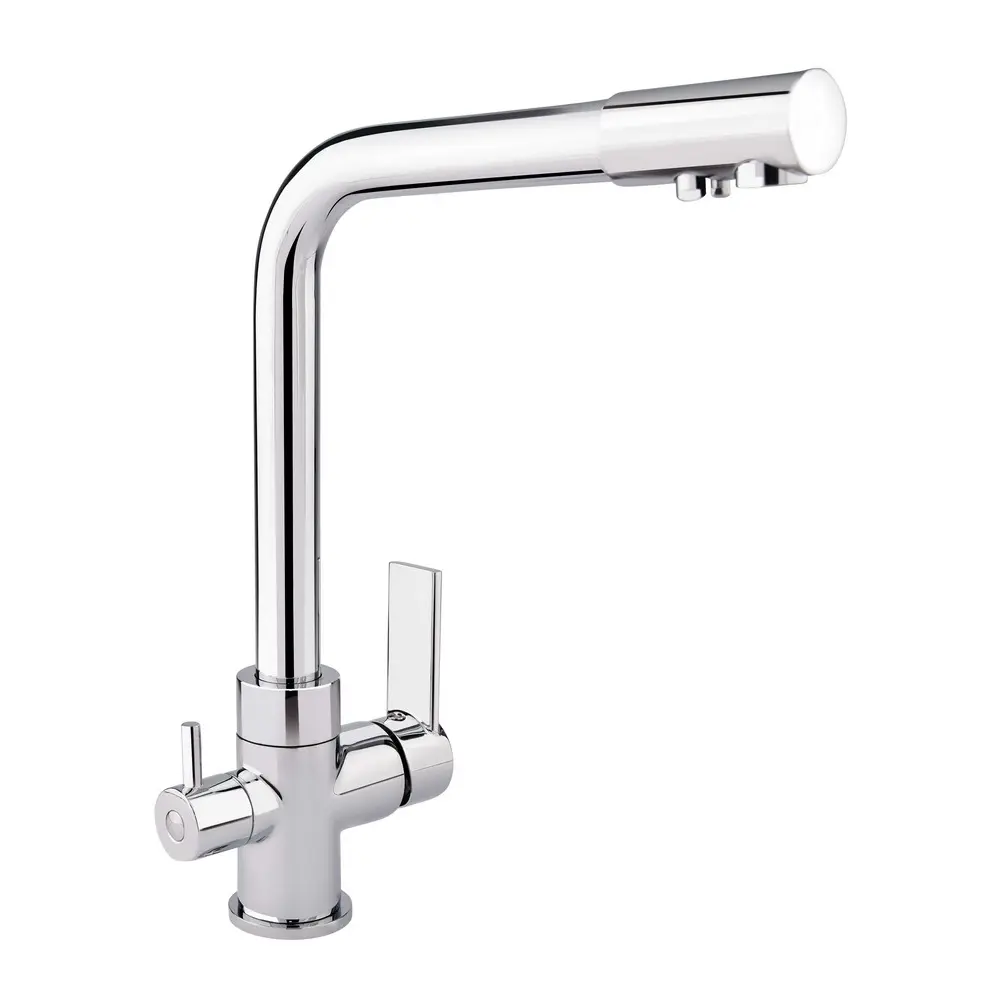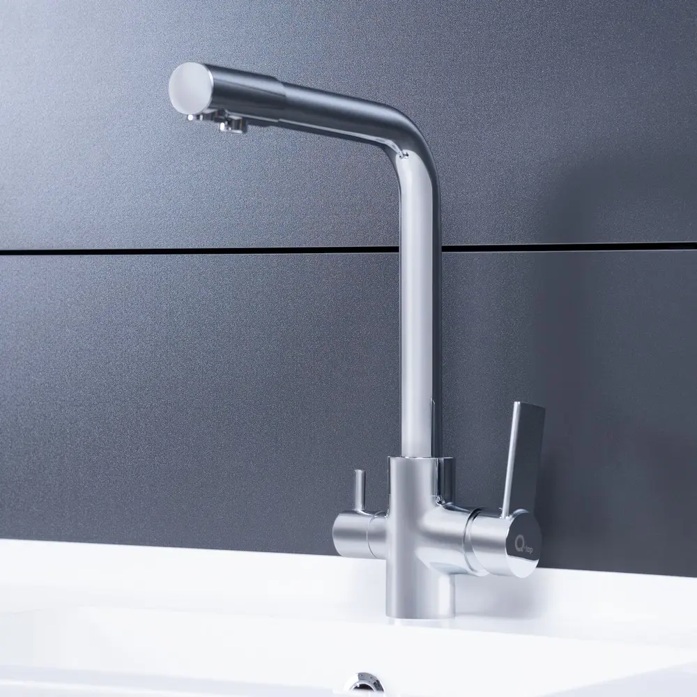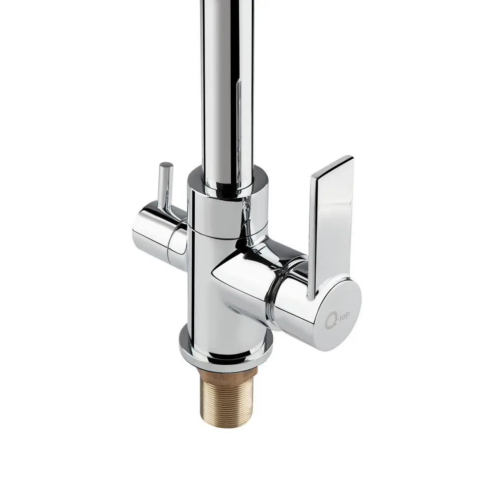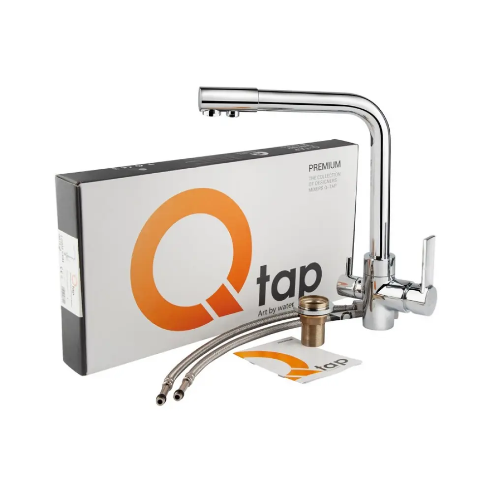 Змішувач для кухні з підмиканням до фільтра Qtap Form CRM 007F-2 виготовлений з високоякісної харчової латуні, яка стійка до впливу корозії, ударів і появи тріщин. Глянсове хромоване покриття не тільки підвищує довговічність змішувача, а й надає йому привабливості. Змішувач має Г-подібну форму з 3-ма контурами підключення води. За участю першого та другого здійснюється підмикання холодної та гарячої води, де змішування відбувається за допомогою картриджа з великим руків‘ям.