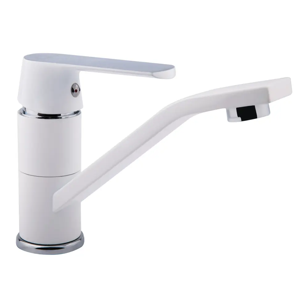 Змішувач для кухні Qtap Fresh WCR 003M виготовлений з високоякісної харчової латуні, яка стійка до впливу корозії, ударів і появи тріщин. Матова поверхня білого кольору зі вставками хрому на важелі надає змішувачу оригінальності. Змішувач має одноважільне управління, за допомогою якого можна відрегулювати температуру і напір холодної та гарячої води. Виконаний в сучасному стилі, з поворотним виливом та стане справжньою родзинкою в інтер‘єрі кухні.