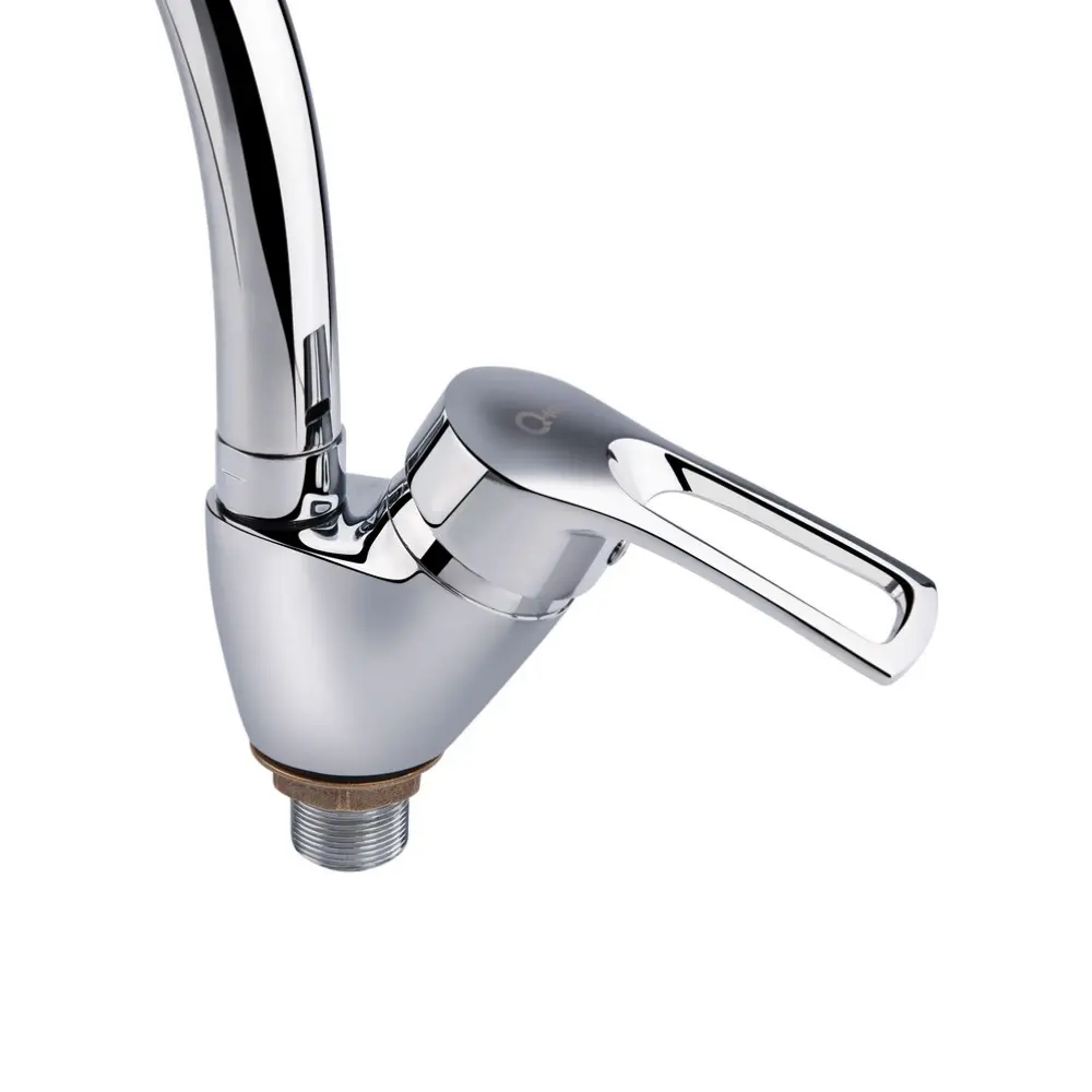 Змішувач для кухні Qtap Hansberg CRM 008F виготовлений з високоякісної харчової латуні, яка стійка до впливу корозії, ударів і появи тріщин. Глянсове хромоване покриття не тільки підвищує довговічність змішувача, а й надає йому привабливості. Змішувач має одноважільне управління, за допомогою якого можна відрегулювати температуру і напір холодної та гарячої води. Виконаний в сучасному дизайні, який ідеально доповнить інтер‘єр кухні.
