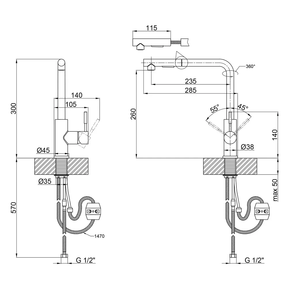Змішувач, Шланг для висувної лійки, Гнучкий підвід, Ключ для аєратора, Кріпильні деталі, Якір