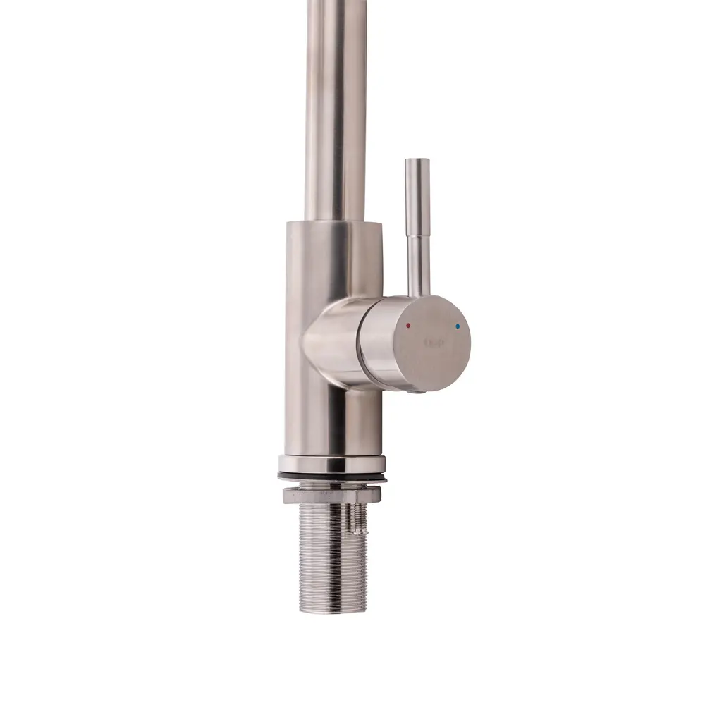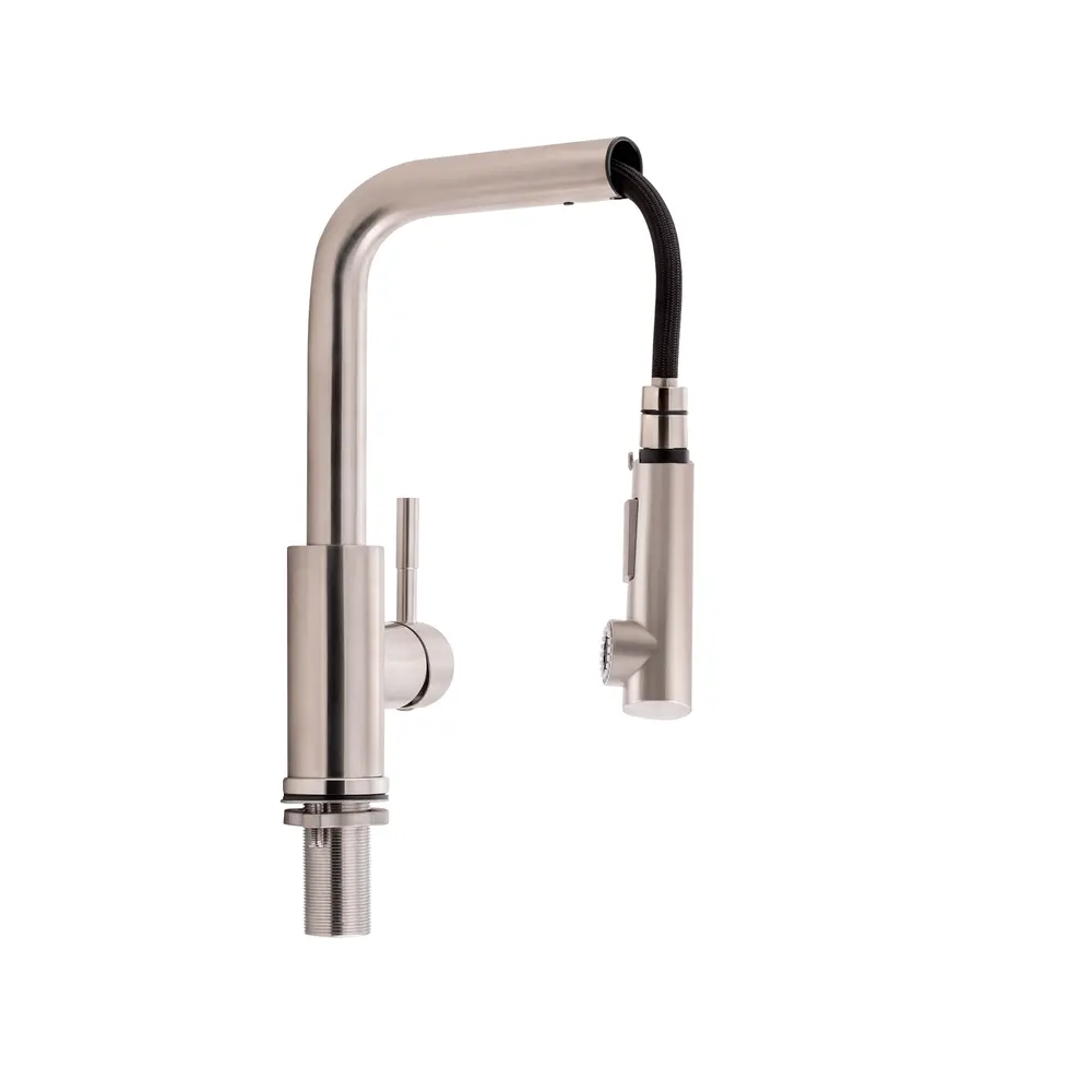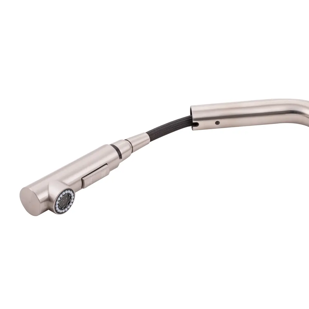 Змішувач для кухні з висувним виливом Qtap Karuska 9139103FN виготовлено з високоякісної нержавіючої сталі з брашованим нікельованим покриттям, що забезпечує довговічну безперебійну роботу виробу. Завдяки висувній формі виливу і двом режимам подачі струменя, які перемикаються кнопкою на виливі, можна з легкістю очистити важкодоступні місця на посуді. Довжина висувного шланга 1470 мм. Управління температурою і напором води здійснюється за допомогою зручного важеля.