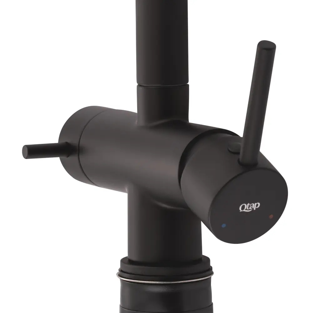 Змішувач для кухні з фільтром Qtap Kuchyne 92102UB виготовлено з високоякісної харчової латуні, що не схильна до корозії, стійка до ударів і появи тріщин. Матове чорне покриття підвищує довговічність змішувача, надає йому привабливості. Змішувач має одноважільне управління, за допомогою якого можна відрегулювати температуру і натиск води. Змішувач може підключатися до фільтру для подачі фільтрованої води. Виріб виконано у сучасному стилі.