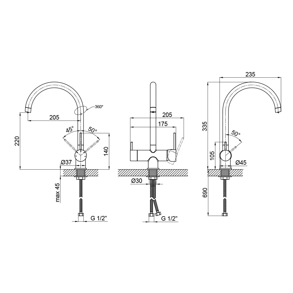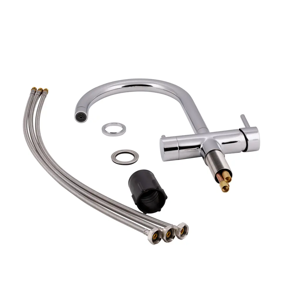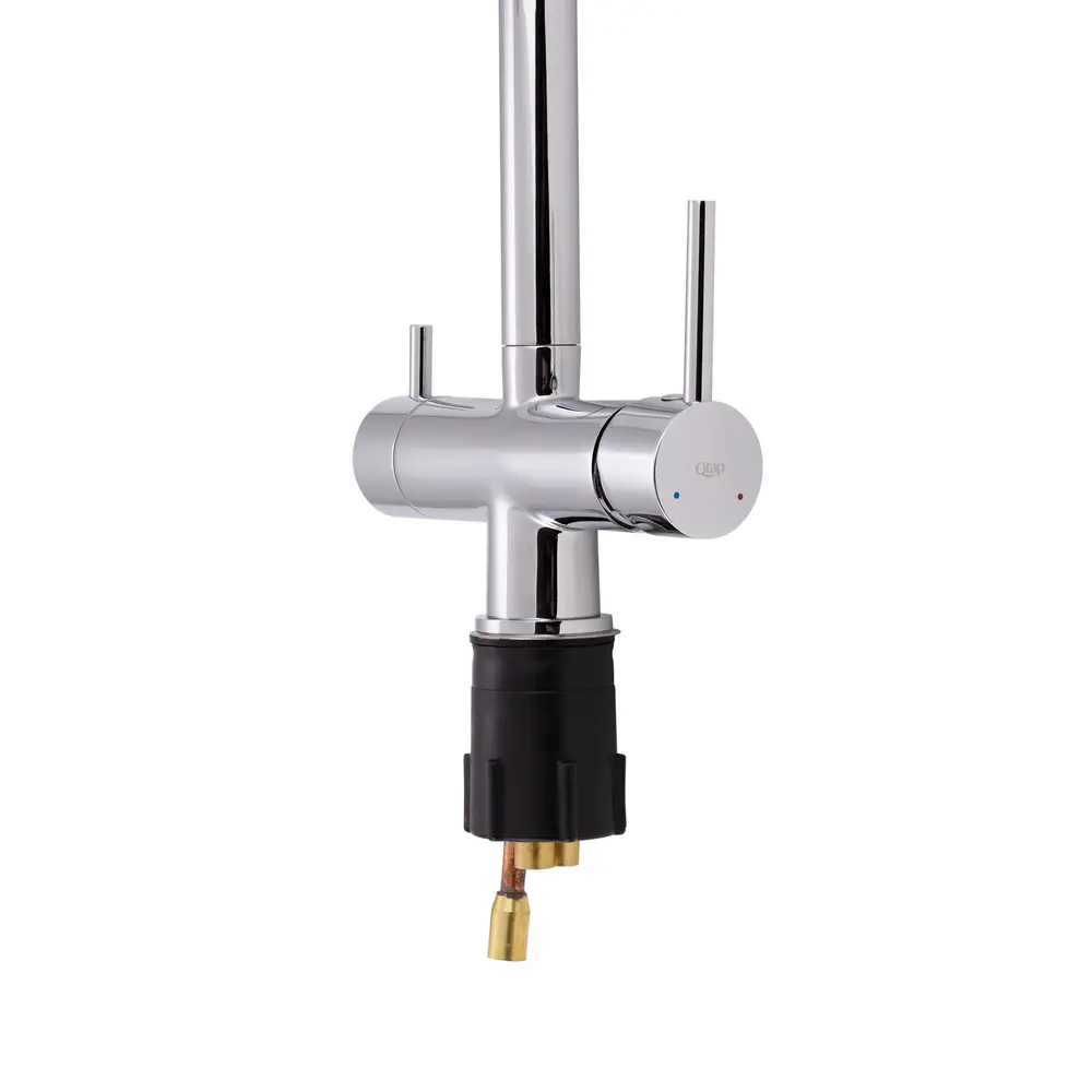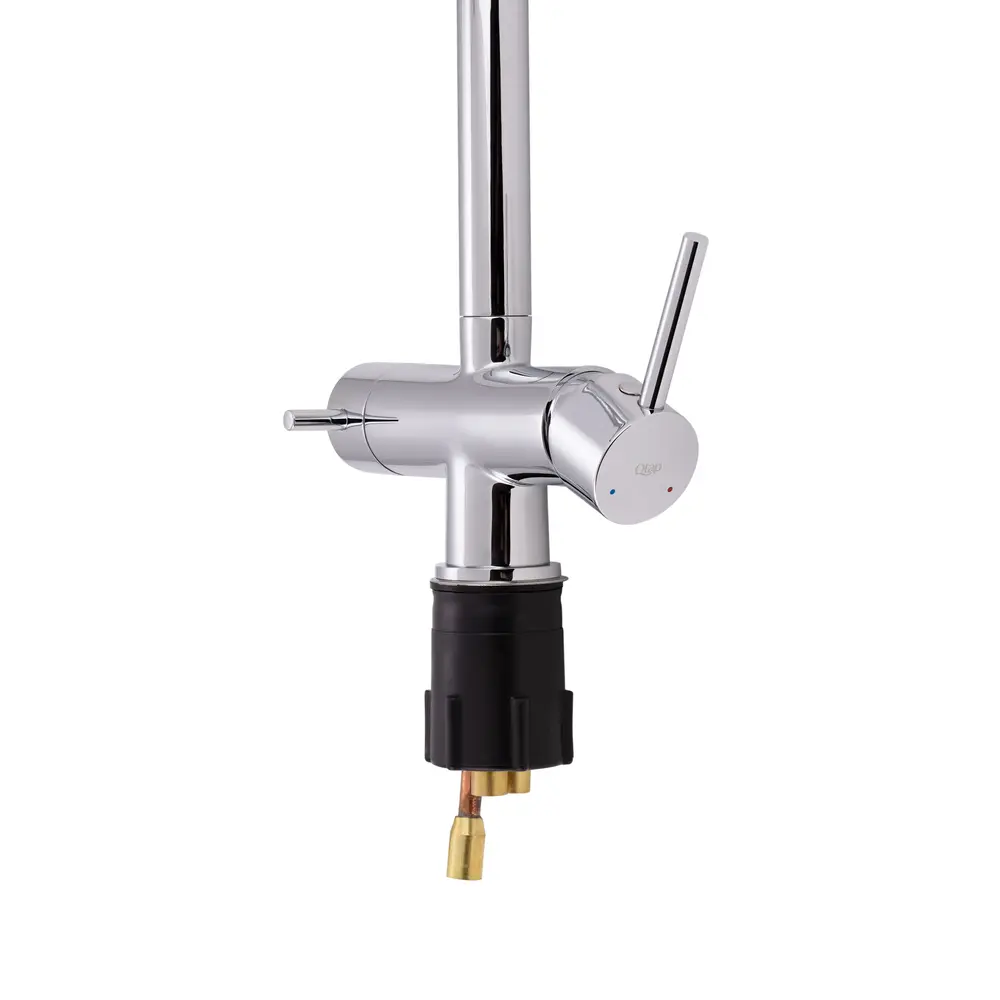 Змішувач для кухні Qtap Kuchyne 92102UC виготовлено з високоякісної харчової латуні, що не схильна до корозії, стійка до ударів і появи тріщин. Глянцеве хромоване покриття підвищує довговічність змішувача, надає йому привабливості. Змішувач має одноважільне управління, за допомогою якого можна відрегулювати температуру і натиск води. Змішувач може підключатися до фільтру для подачі фільтрованої води. Виріб виконано у сучасному стилі.