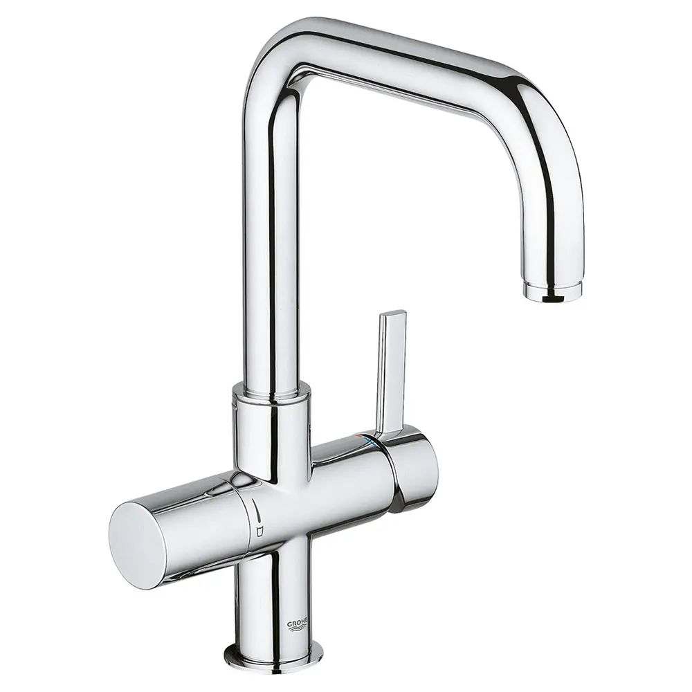 Змішувач для кухні з фільтром Grohe Blue 31303000 виготовлений з латуні з хромованим покриттям, завдяки якому він має оригінальний зовнішній вигляд. Комбінований змішувач на 2 типи води виконує дві основні функції: подача водопровідної води (для господарських потреб) і подача фільтрованої води (для пиття чи приготування їжі). Виконано в сучасному дизайні і підійде для будь-якої вишуканої кухні.
