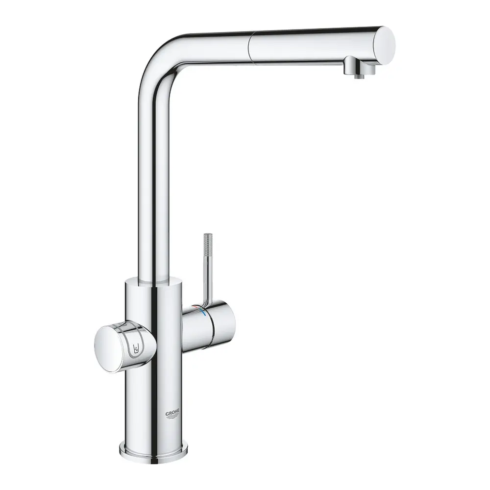 Змішувач для кухні з фільтром Grohe Blue Home 31539000 виготовлений з латуні. Завдяки хромованому покриттю має оригінальний зовнішній вигляд. Комбінований змішувач на 2 води виконує дві основні функції: подача змішаної водопровідної води (для господарських потреб) і подача фільтрованої і газованої води (для пиття чи приготування їжі). Виконано в сучасному дизайні і підійде для будь-якої вишуканої кухні.