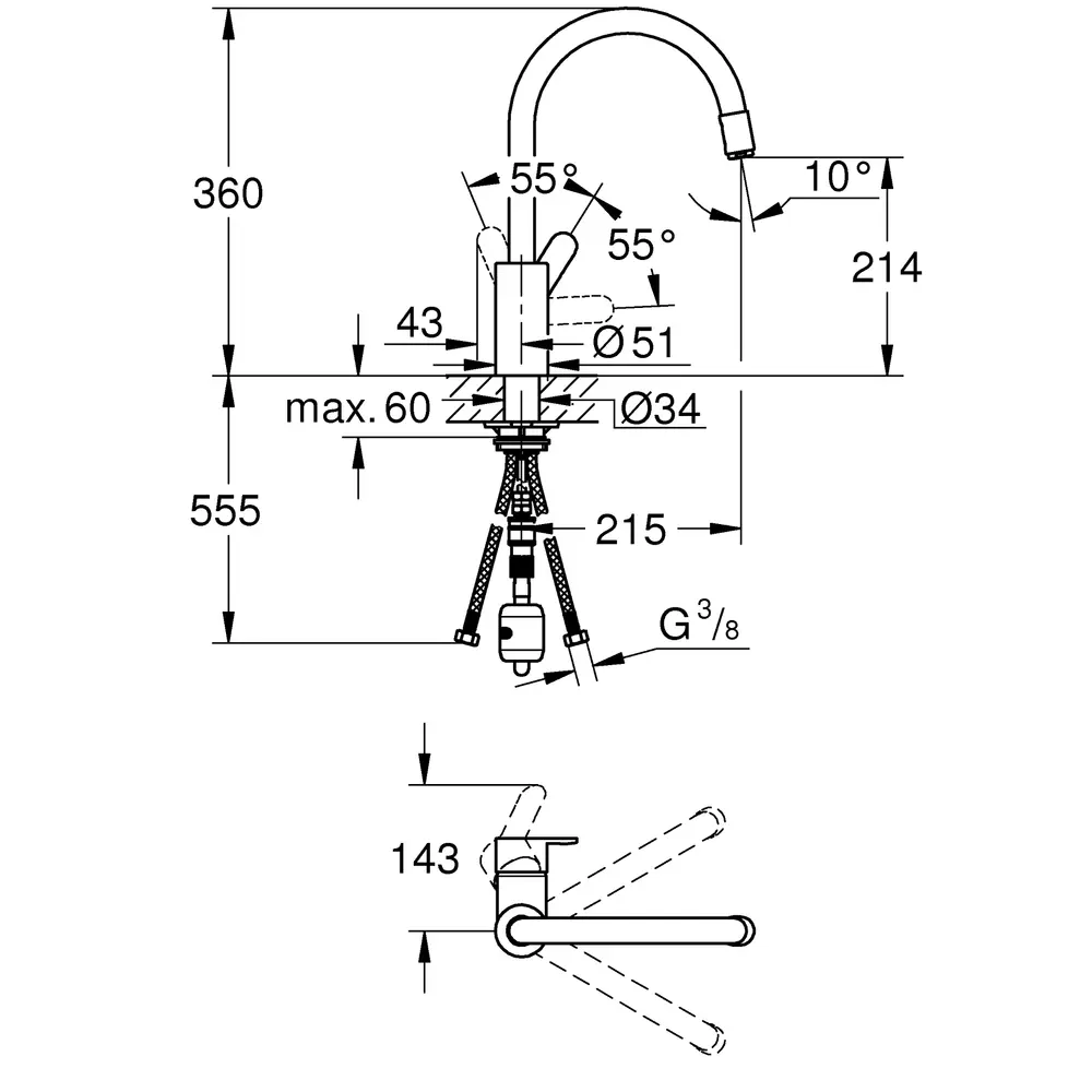 Змішувач, шланг для висувної лійки, гнучка підводка, кріплення, якір.