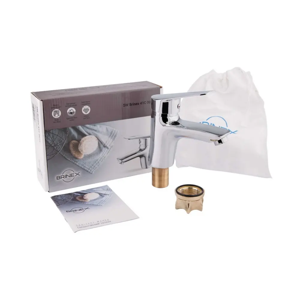 Змішувач для раковини Brinex 41C 001F виготовлений із металу. Глянцева хромована поверхня змішувача надає йому оригінальний зовнішній вигляд. Виконаний в сучасному стилі зі зручним важелем для регулювання натиску і температури води.
