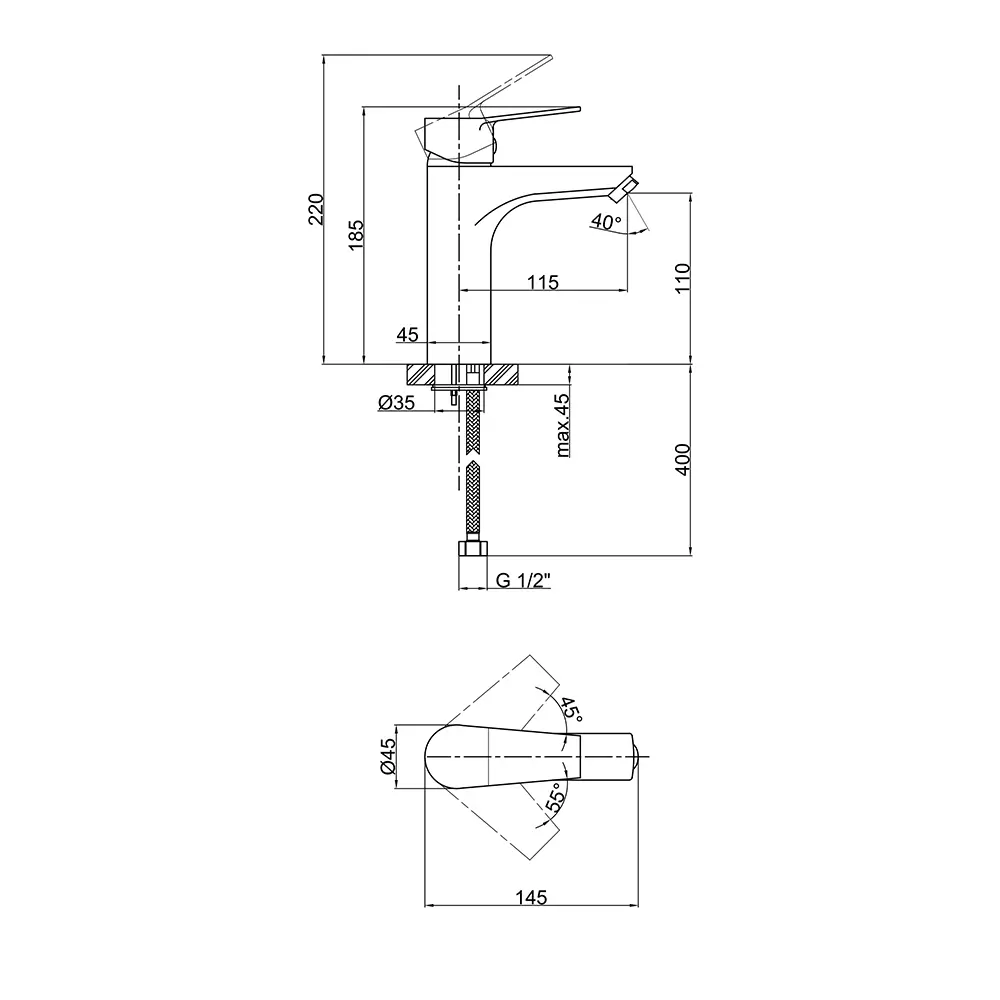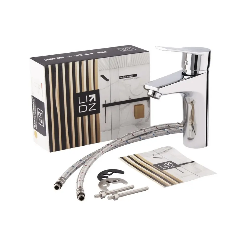 Змішувач для раковини з фіксованим виливом Lidz (CRM) 40 87 001-2 виконаний з глянсовою блискучою поверхнею. Він монтується в отвір для змішувача на раковині або на стільниці врізним способом. Напір води і її температура регулюються поворотом важеля в необхідне положення. Для зручності його ручка трохи вигнута вгору. Важіль має нанесені маркування Х + Г води і фірмовий логотип виробника.