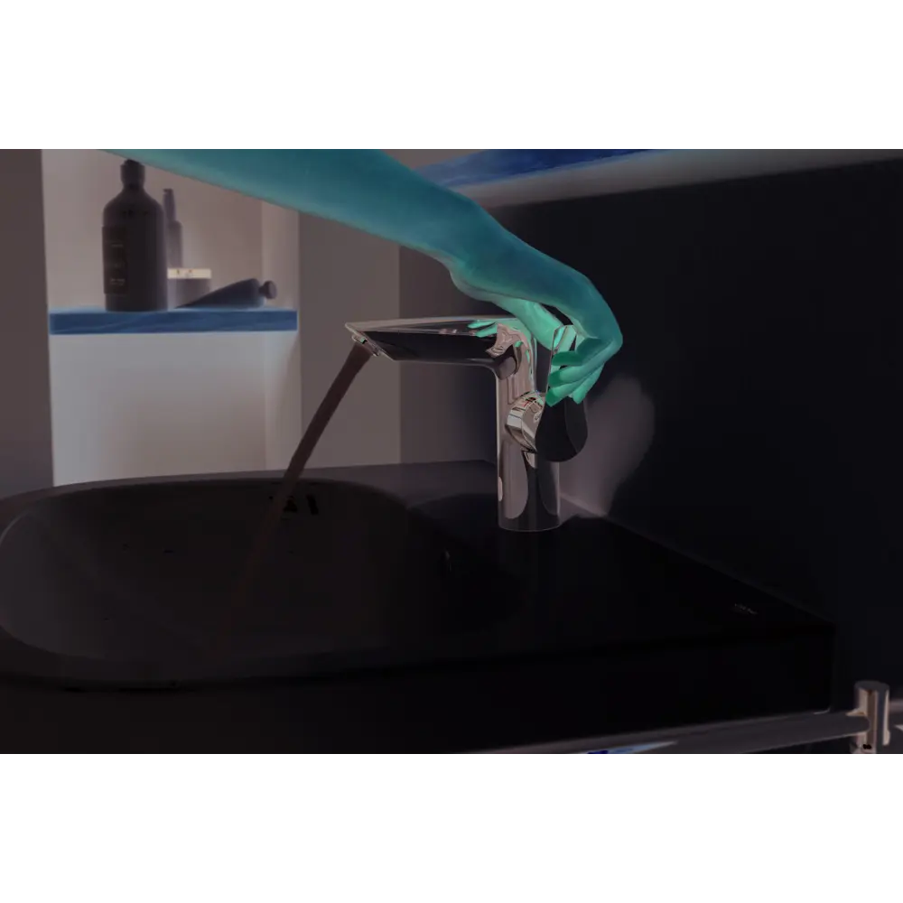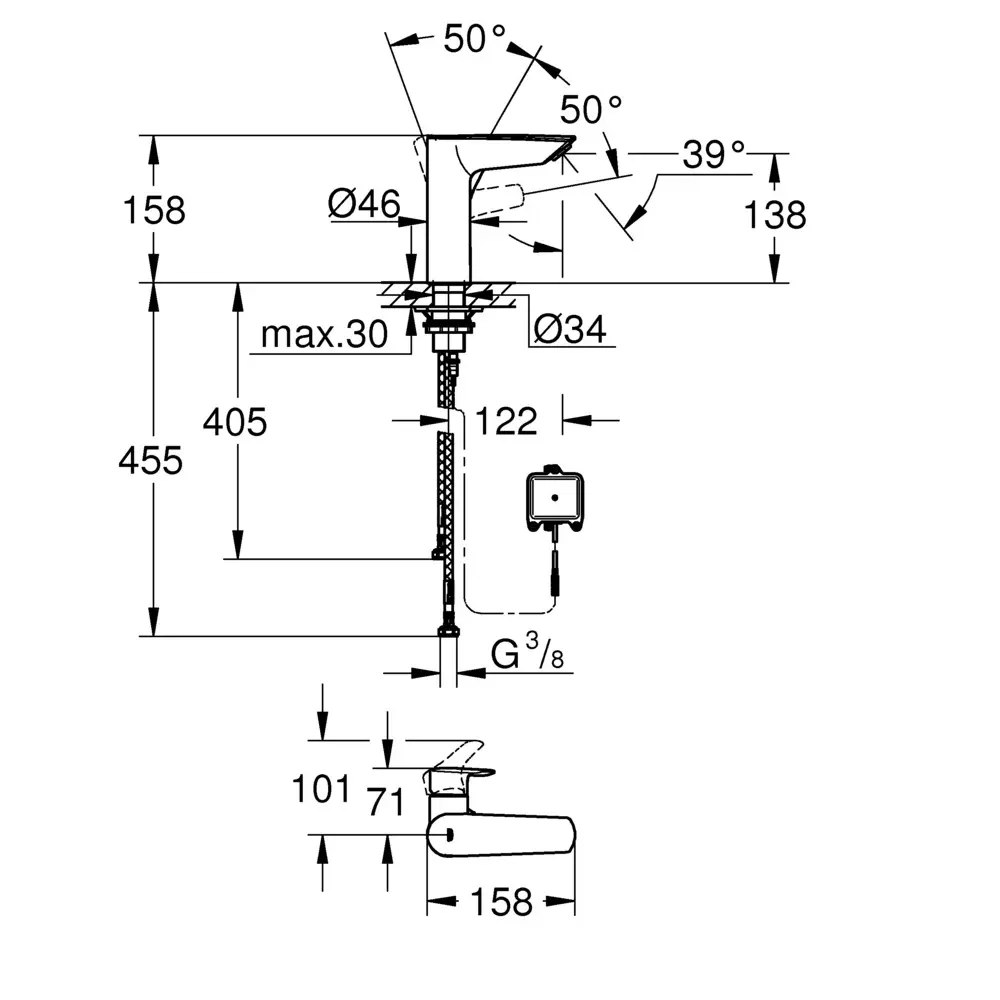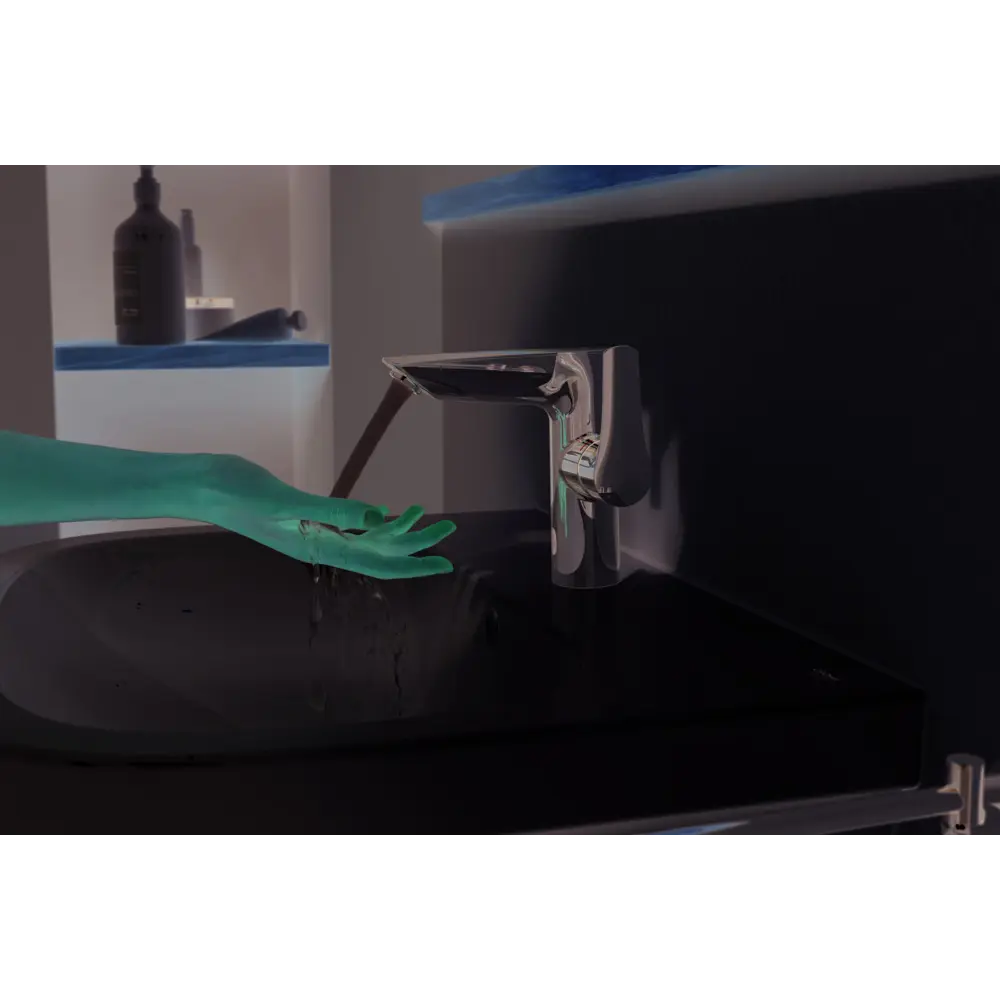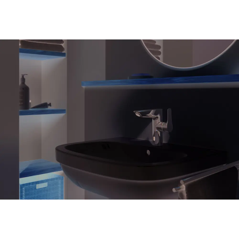 Смеситель, гибкая подводка, блок питания сети, крепежи.