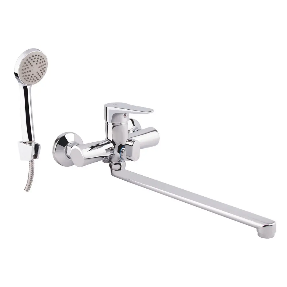 Змішувач для ванни GF (CRM)/S-01-005AN з довгим поворотним виливом укомплектований тримачем ручного душу, душовим шлангом і лійкою хромованого кольору. Для вмикання потоку води передбачено важіль з нанесеним маркуванням Х+Г води, для перемикання на душ - поворотний дивертор. Настінний монтаж здійснюється за допомогою кріпильних деталей, які комплектуються разом зі змішувачем. Круглі розетки приховають сліди установки на обробці.
