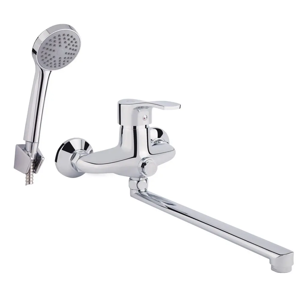 Змішувач для ванни GF (CRM)/S-03-005B з довгим поворотним виливом виготовлений з силуміну, укомплектований кронштейном для лійки, душовим шлангом і лійкою. Для вмикання потоку води передбачено вигнутий важіль з нанесеним маркуванням Х+Г води, для перемикання на душ - натискний дивертор. Настінний монтаж здійснюється за допомогою кріпильних деталей, які комплектуються разом зі змішувачем. Круглі розетки приховають сліди установки на обробці.