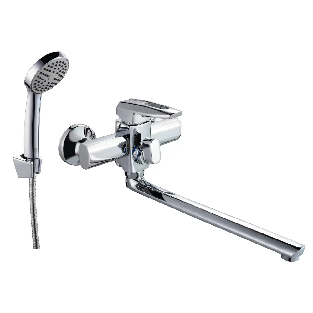 Змішувач для ванни GF (CRM)/S-09-005AN з довгим поворотним виливом виготовлений з силуміну, укомплектований кронштейном для ручного душу, душовим шлангом і лійкою. Для вмикання потоку води передбачено масивний важіль з отвором, для перемикання на душ - поворотний дивертор-важіль. Настінний монтаж здійснюється за допомогою кріпильних деталей, які комплектуються разом зі змішувачем. Круглі розетки приховають всі погрішності установки на обробці ванної кімнати.