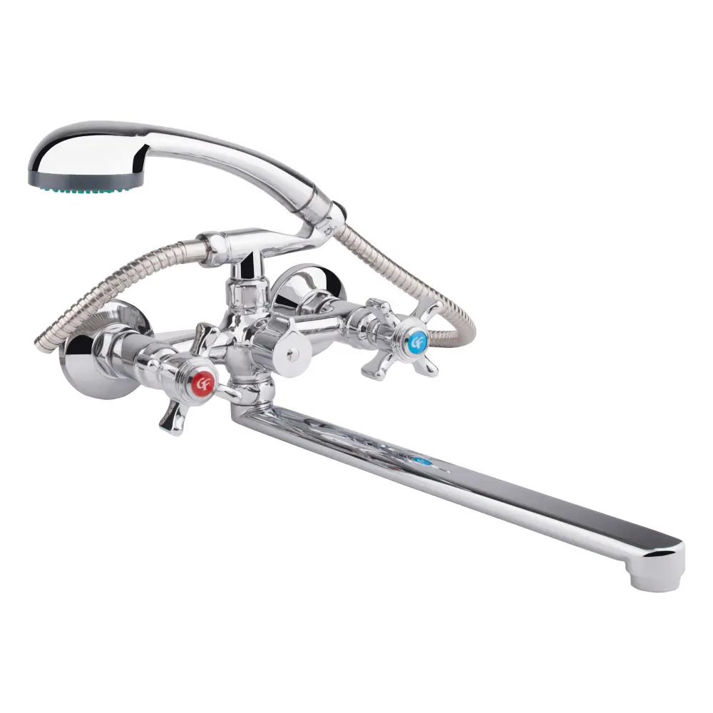 Змішувач для ванни GF (CRM)/S-22-140 з довгим поворотним виливом виконаний з інтегрованим шланговим під‘єднанням, укомплектований душовим шлангом і лійкою. Для вмикання потоку води передбачено два вентиля з нанесеними маркуванням Х+Г води і фірмовими логотипами виробника, для перемикання на душ - поворотний дивертор. Настінний монтаж здійснюється за допомогою кріпильних деталей, які комплектуються разом зі змішувачем. Круглі розетки приховають сліди установки на обробці.