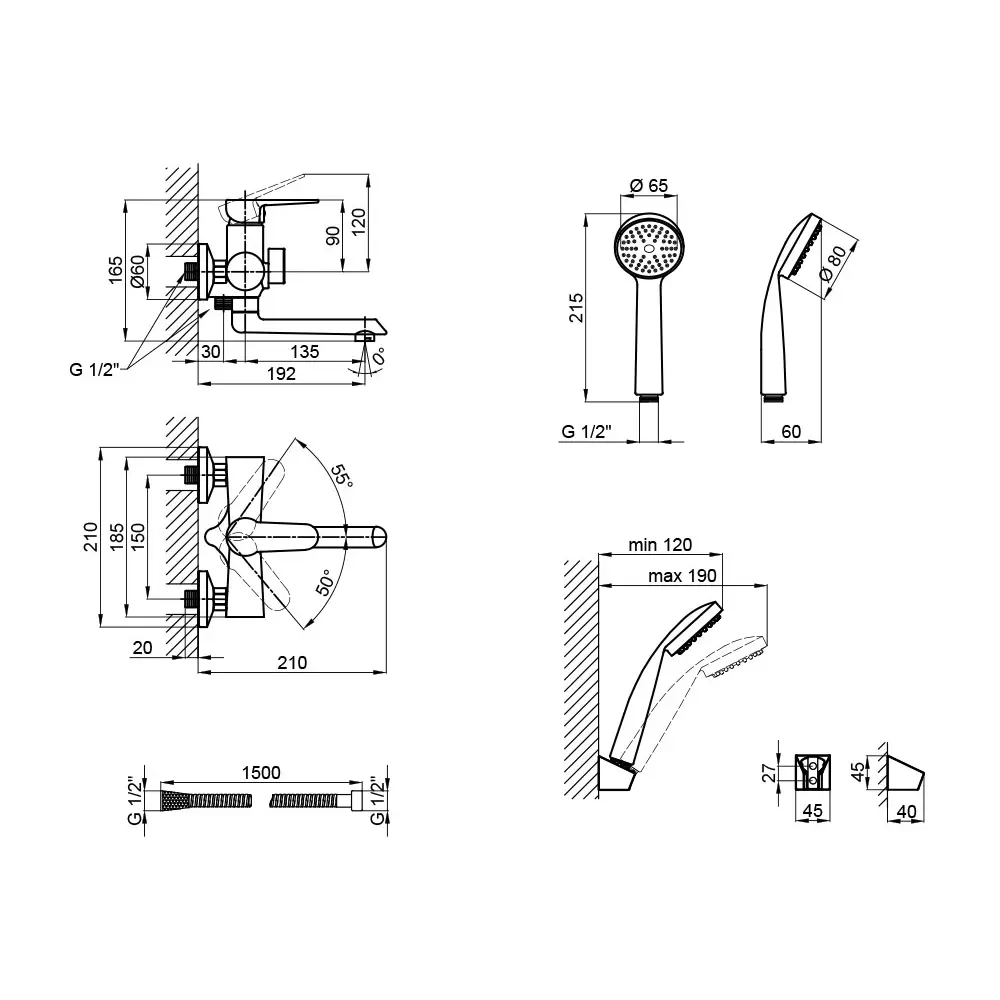 Змішувач, Душовий шланг, Лійка для ручного душу, Тримач для душу, Кріплення