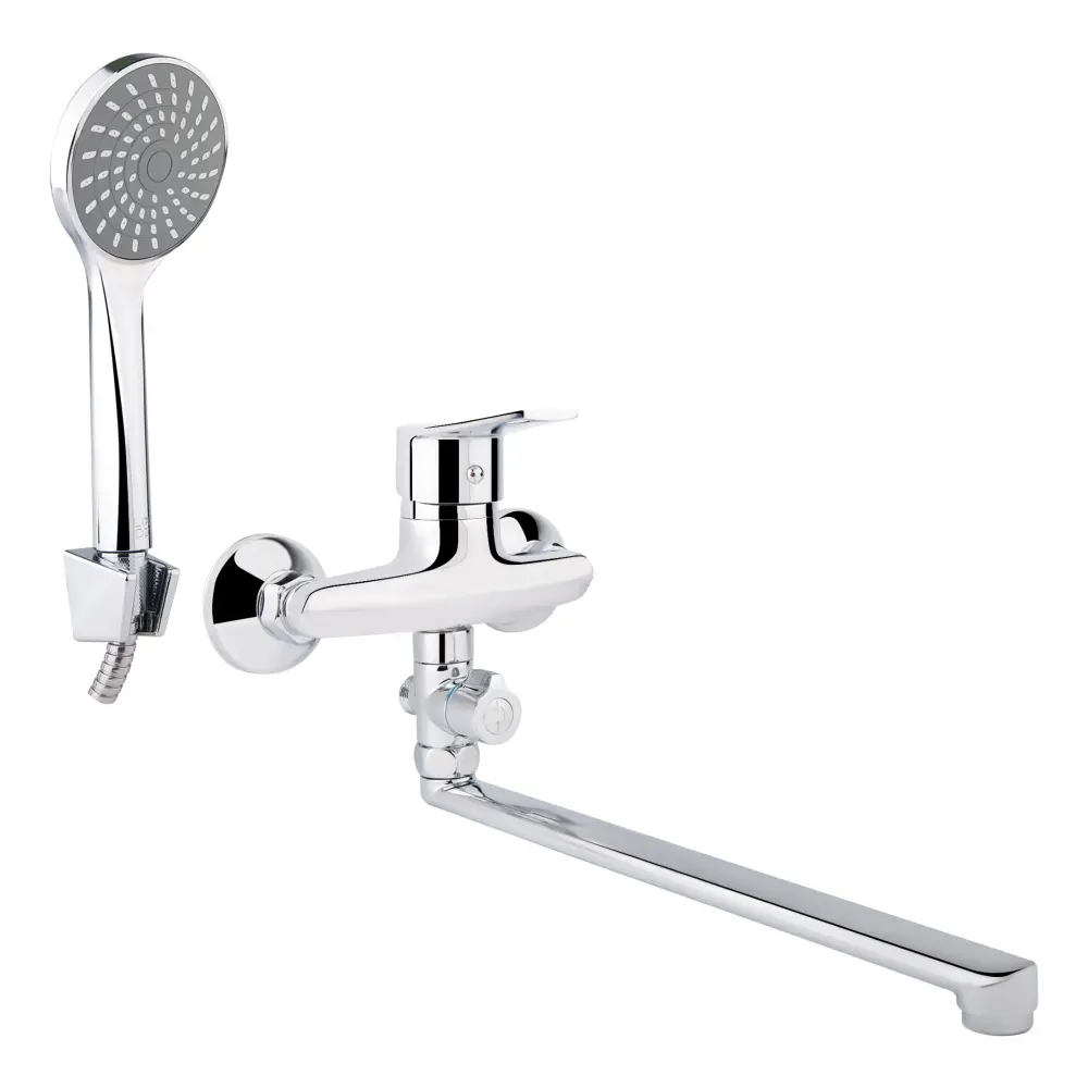 Змішувач для ванни Lidz (CRM) 20 38 005 02 має довгий вилив і вигнуте руків‘я з нанесеним маркуванням Х + Г води. Для вмикання подачі води досить підняти та повернути його в потрібне положення. Змішувач та тримач лійки монтуються на стіну за допомогою кріпильних елементів, які є в комплекті. Круглі хромовані розетки приховають похибки установки на обробці ванної кімнати. Перемикання на ручний душ виконується поворотним дивертером.