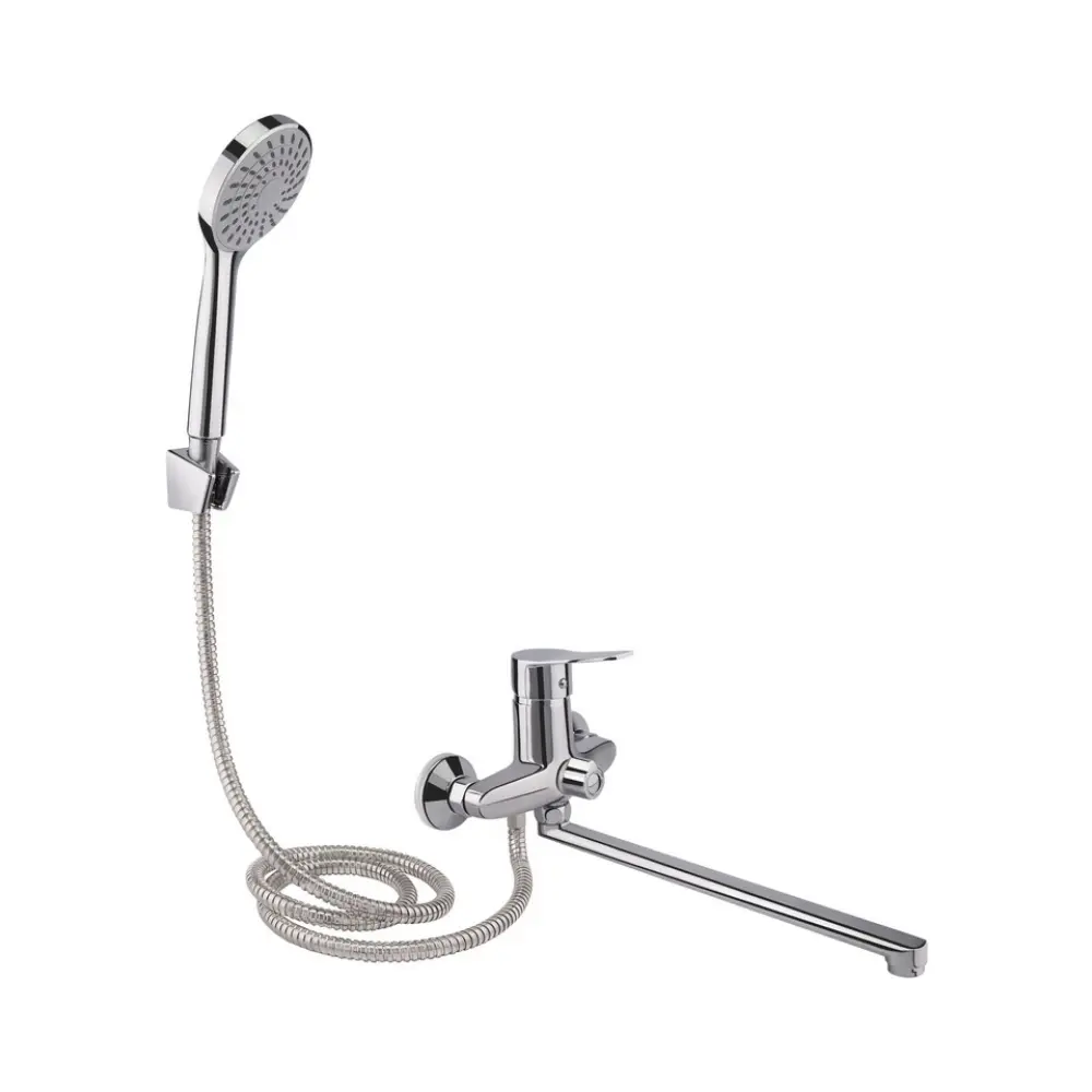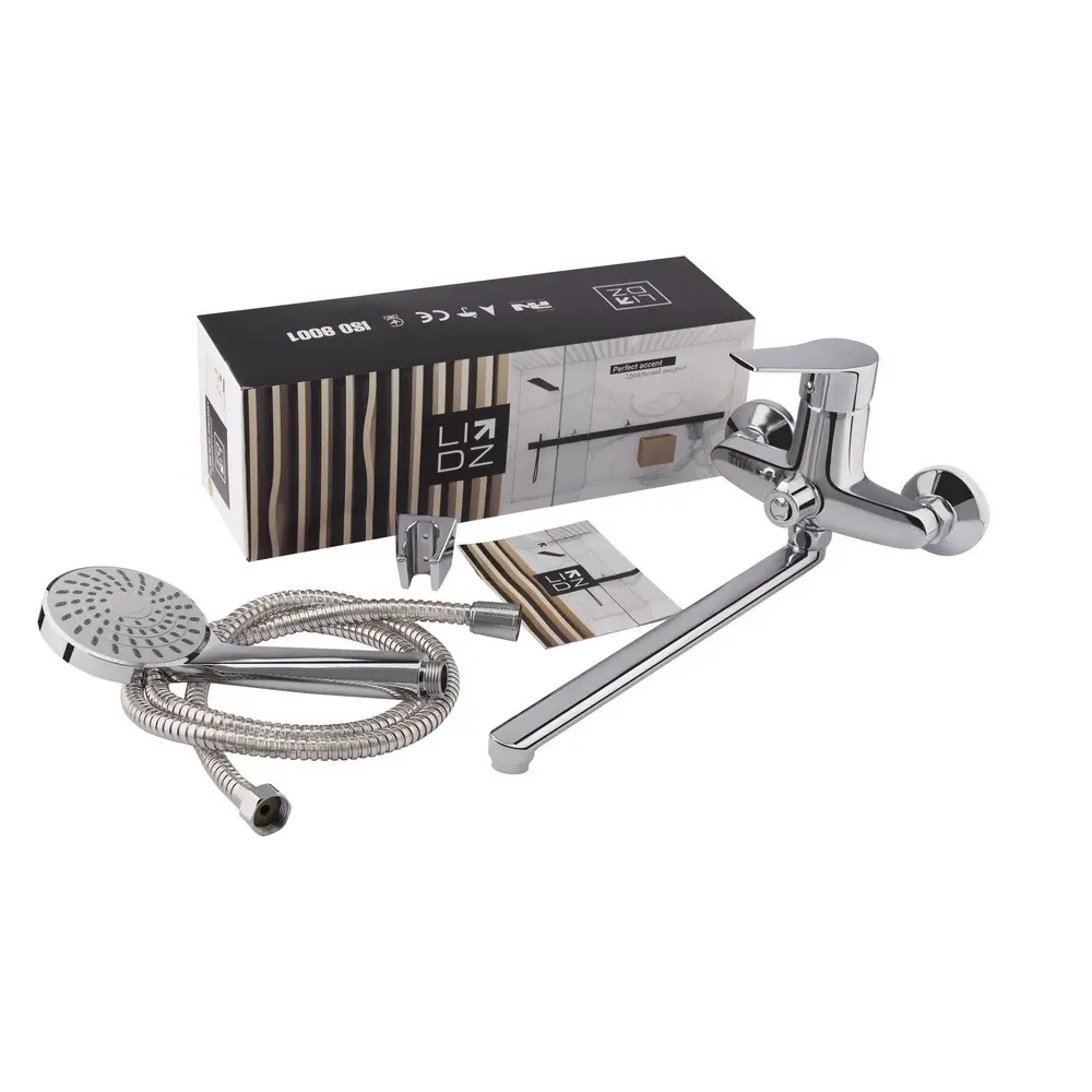 Змішувач для ванни Lidz (CRM) 20 38 005 10 виконаний в хромованому кольорі з глянсовою поверхнею з довгим поворотним виливом. Разом з нерухомим тримачем ручного душу він монтується на стіну над ванною. Круглі декоративні розетки приховають всі похибки установки. Напір води і її температура регулюються поворотом важеля з нанесеним маркуванням Х + Г води в необхідне положення. Перемикання ванна / душ здійснюється поворотом дивертора.
