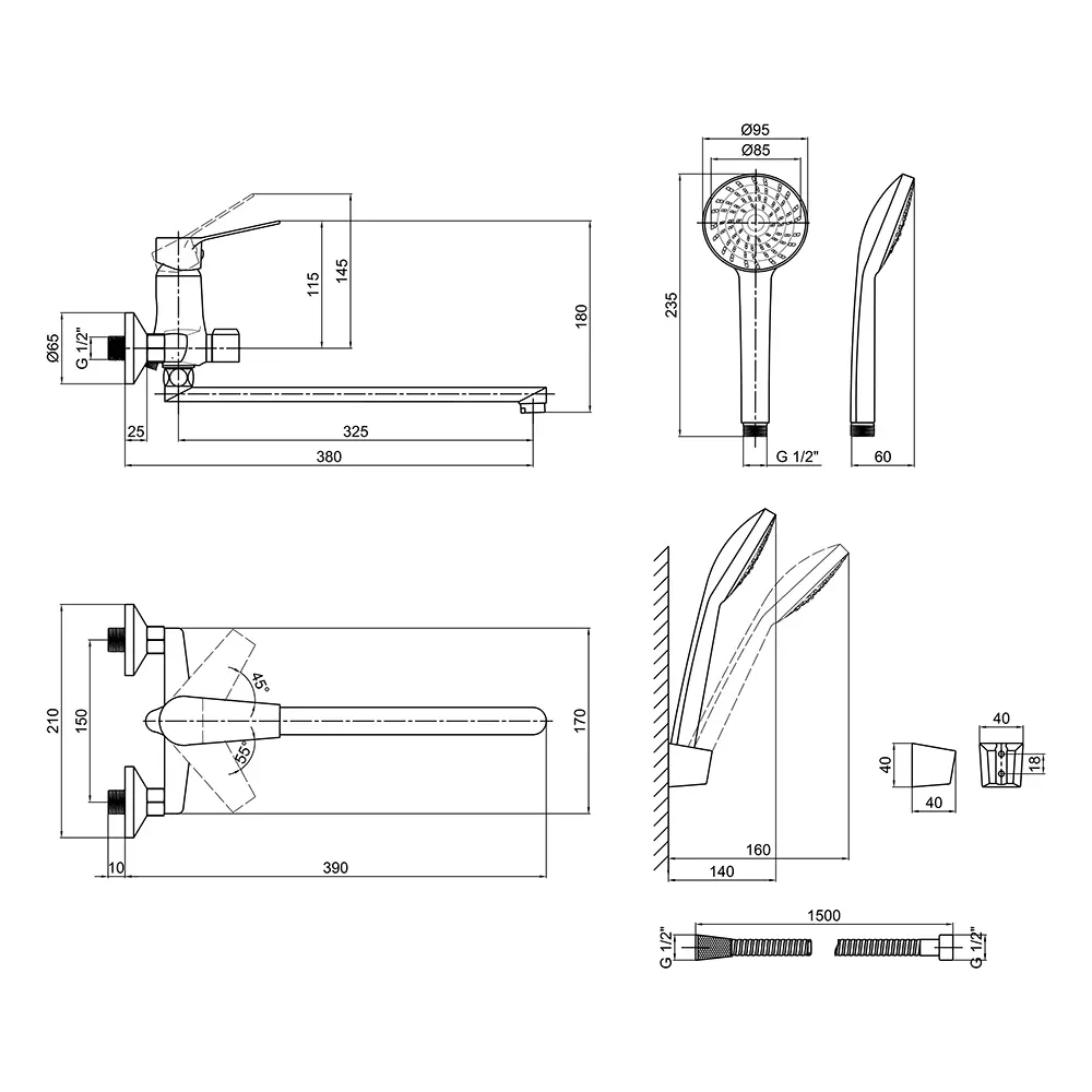Змішувач, Лійка для ручного душу, Душовий шланг, Кронштейн для ручного душу, Кріплення