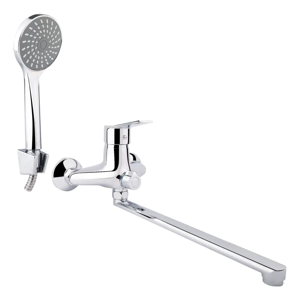 Змішувач для ванни Lidz (CRM) 40 87 005-1 має довгий вилив і вигнуте руків‘я з нанесеним маркуванням Х + Г води. Для вмикання подачі води досить підняти та повернути його в потрібне положення. Змішувач та тримач лійки монтуються на стіну за допомогою кріпильних елементів, які є в комплекті. Круглі хромовані розетки приховають похибки установки на обробці ванної кімнати. Перемикання на ручний душ виконується поворотним дивертером.