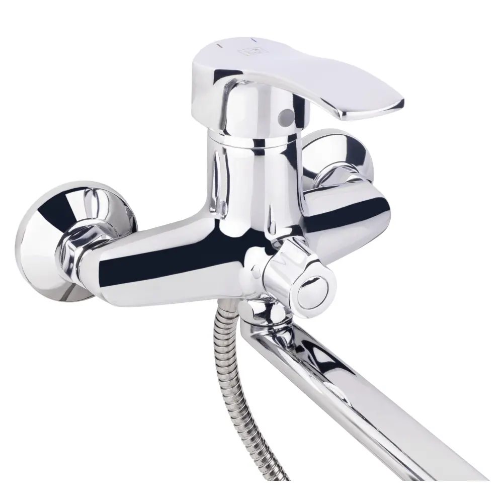 Змішувач для ванни Lidz (CRM) 41 86 005-1 New з довгим поворотним виливом виготовлено з цинку, укомплектовано кронштейном для ручного душа, душових шлангом і лійкою. Завдяки хромованому покриттю має міцну поверхню і привабливий зовнішній вигляд. Декоративні розетки приховають похибки установки на оздобленні кімнати. Напір води і її температура регулюються поворотом важеля в необхідне положення. Перемикання ванна/душ здійснюється за допомогою дивертора.
