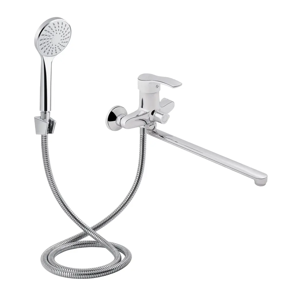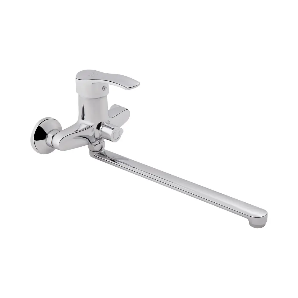 Змішувач для ванни Lidz (CRM) 41 86 005-4 з довгим поворотним виливом виготовлений з цинку, укомплектований кронштейном для ручного душу, душовим шлангом і лійкою. Для вмикання потоку води передбачено масивний важіль, для перемикання на душ - поворотний дивертор-важіль. Настінний монтаж здійснюється за допомогою кріпильних деталей, які комплектуються разом зі змішувачем. Круглі розетки приховають всі погрішності установки на обробці ванної кімнати.