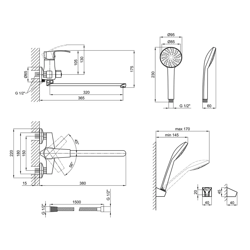 Змішувач, Лійка для ручного душу, Душовий шланг, Кронштейн для ручного душу, Кріплення