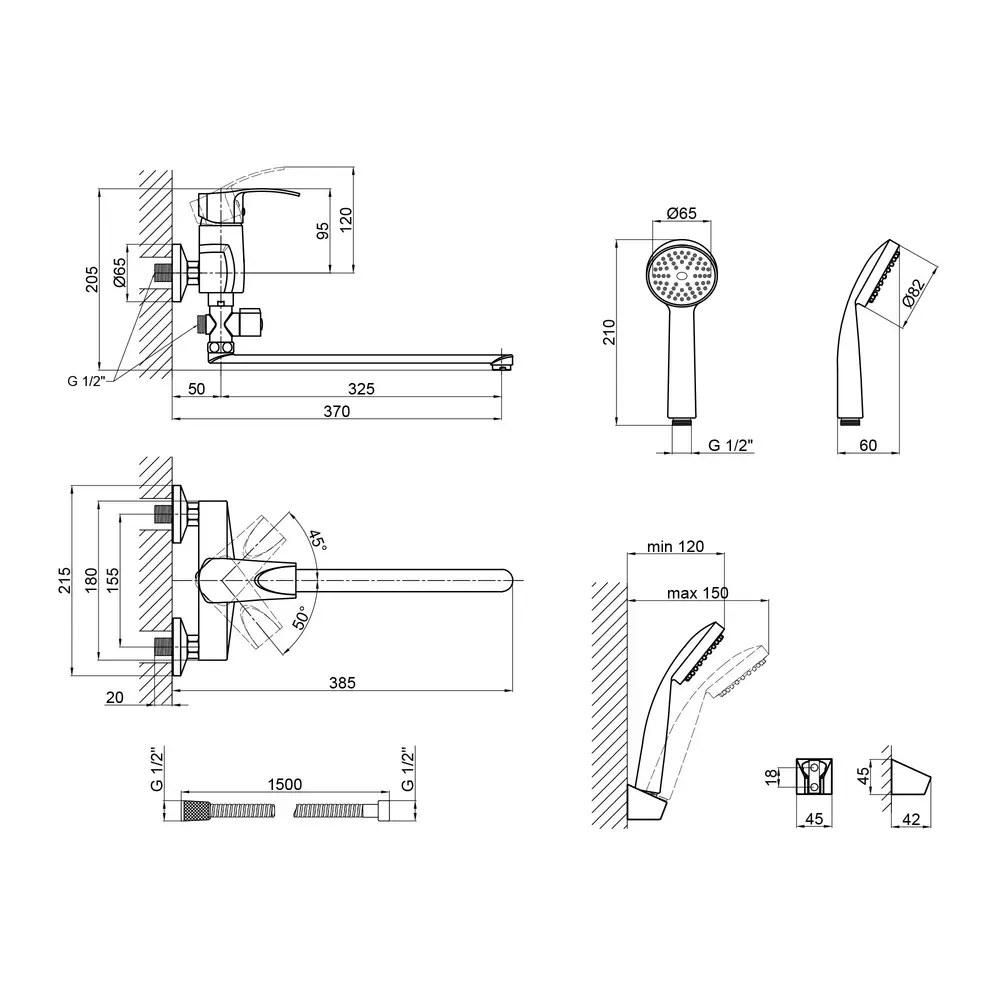 Змішувач, Лійка для ручного душу, Душовий шланг, Кронштейн для ручного душу, Кріплення