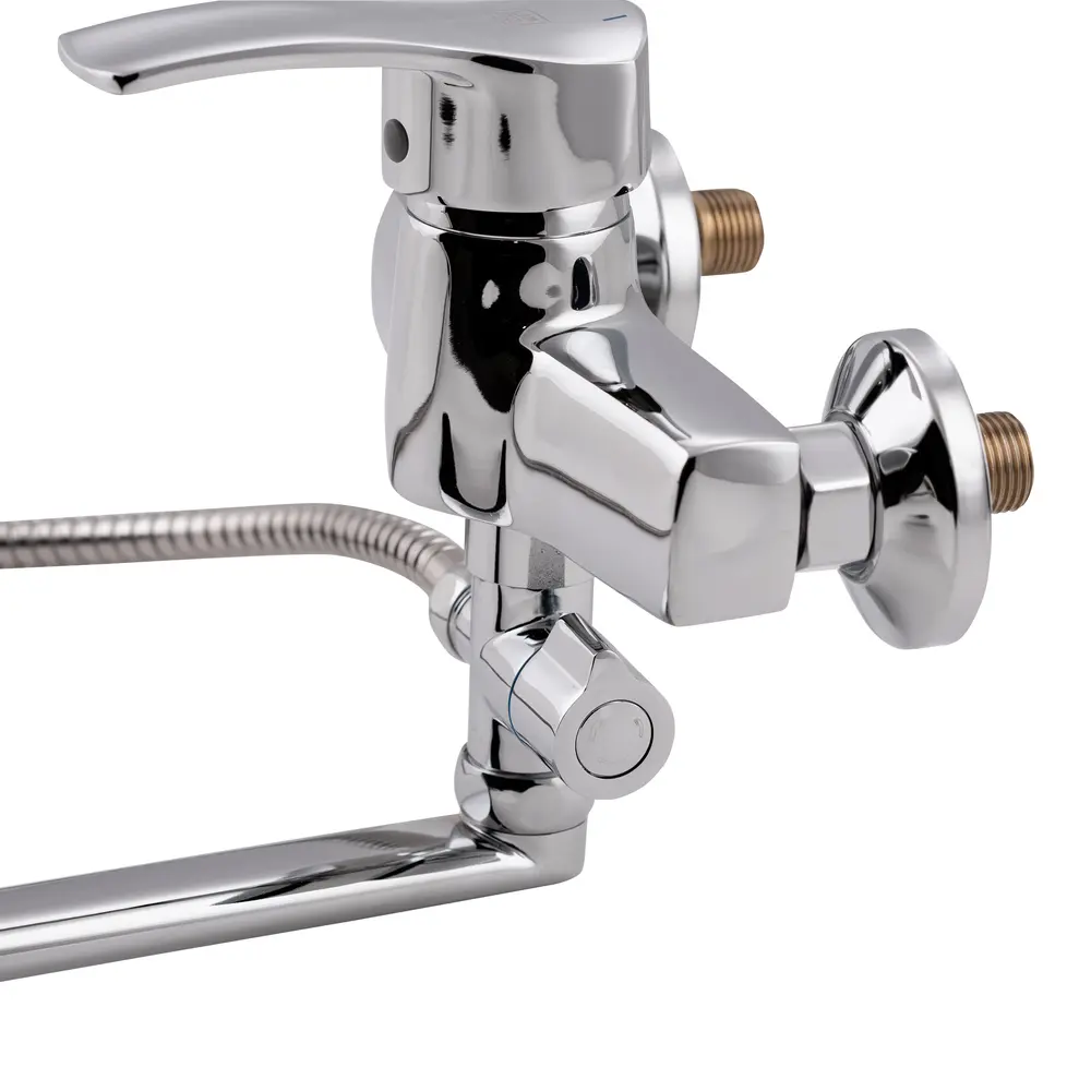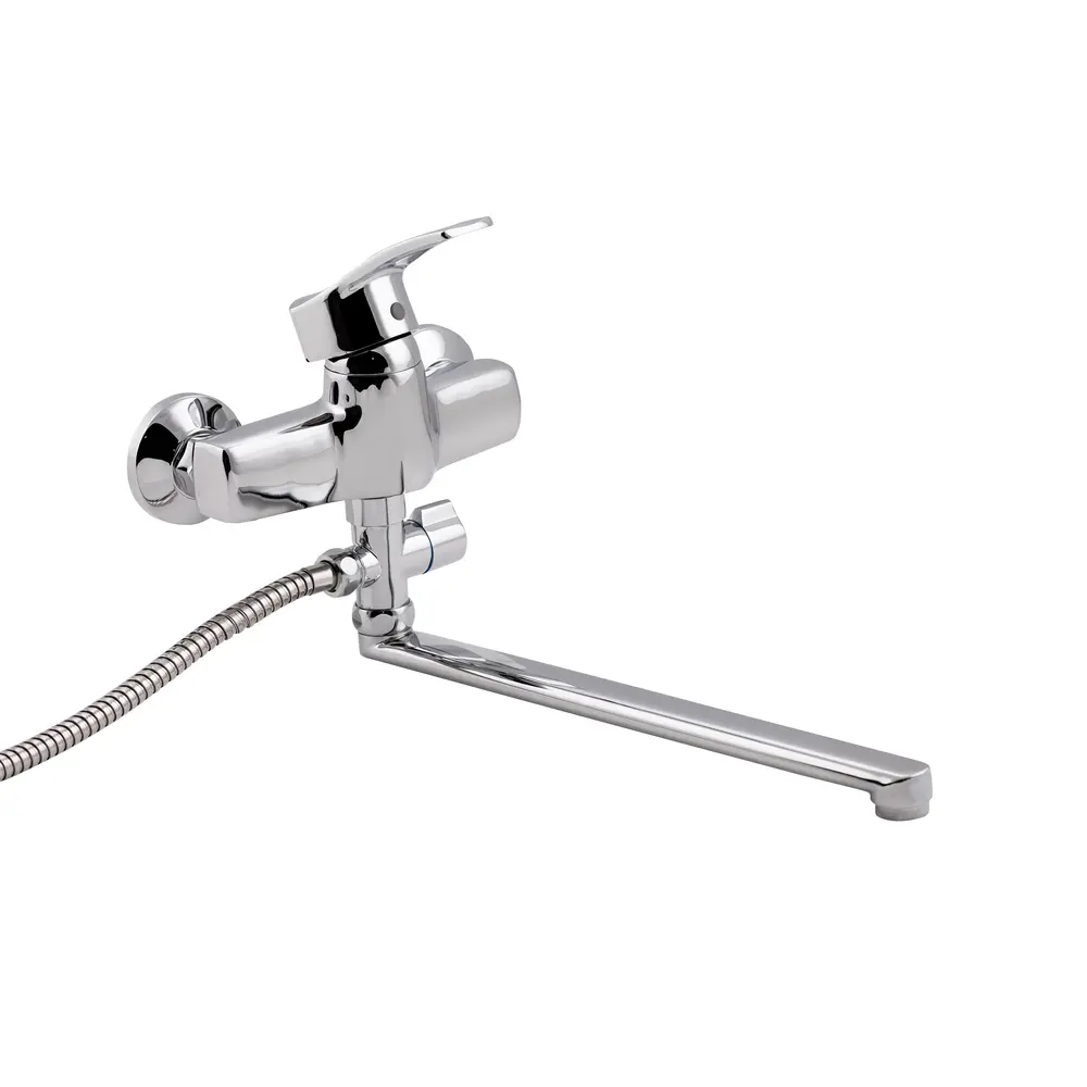Змішувач для ванни Lidz (CRM) 41 86 005C-2 з довгим поворотним виливом виготовлено з цинку, укомплектовано кронштейном для ручного душа, душових шлангом і лійкою. Завдяки хромованому покриттю має міцну поверхню і привабливий зовнішній вигляд. Декоративні розетки приховають похибки установки на оздобленні кімнати. Напір води і її температура регулюються поворотом важеля в необхідне положення. Перемикання ванна/душ здійснюється за допомогою дивертора.